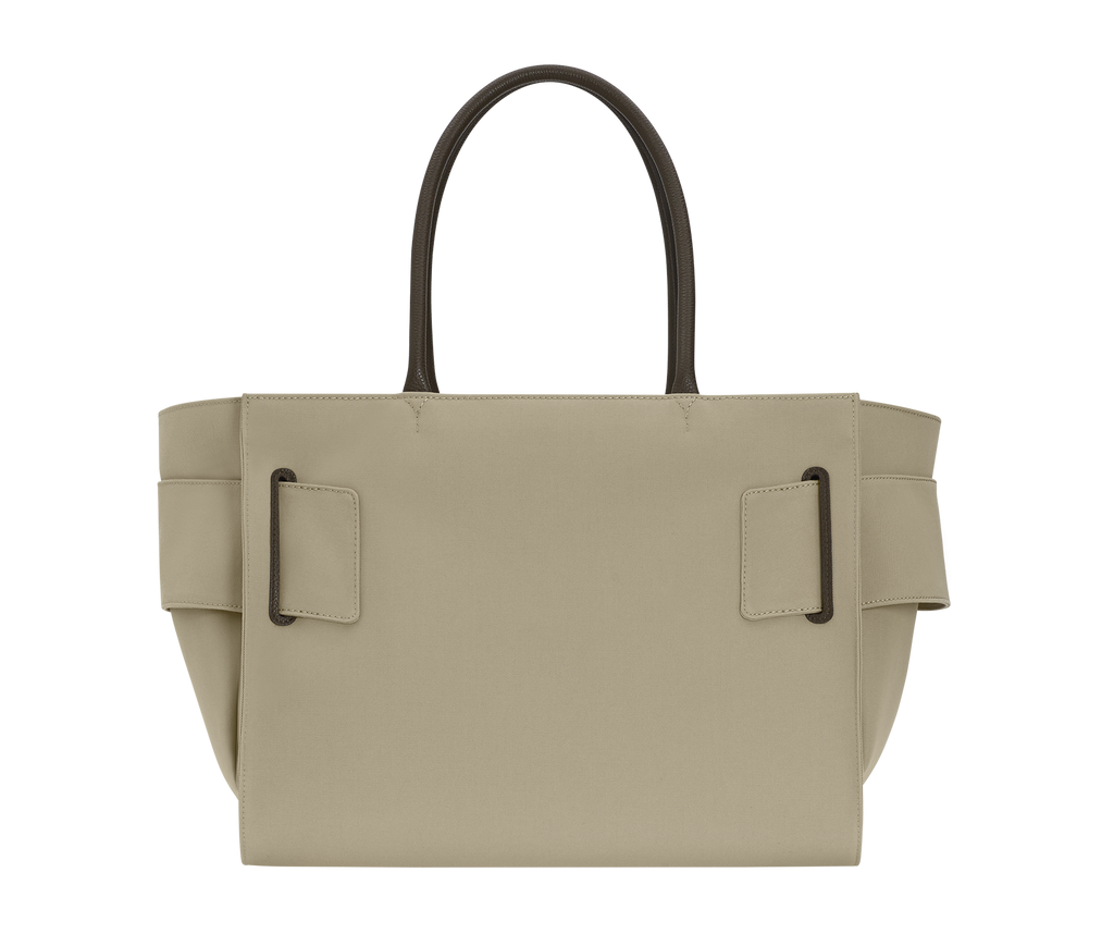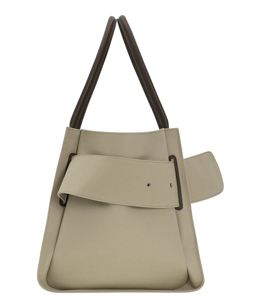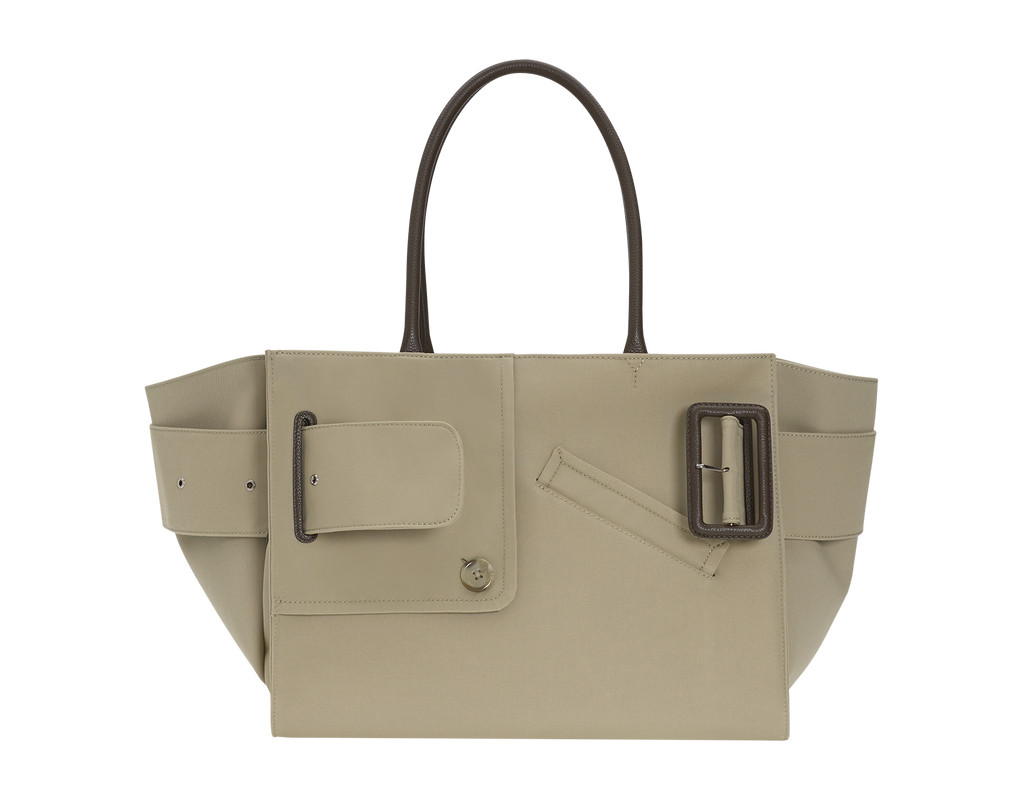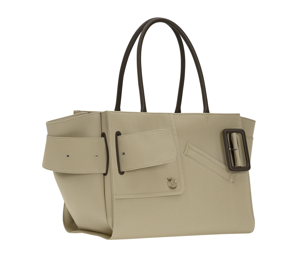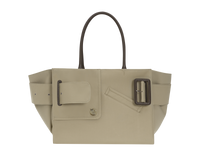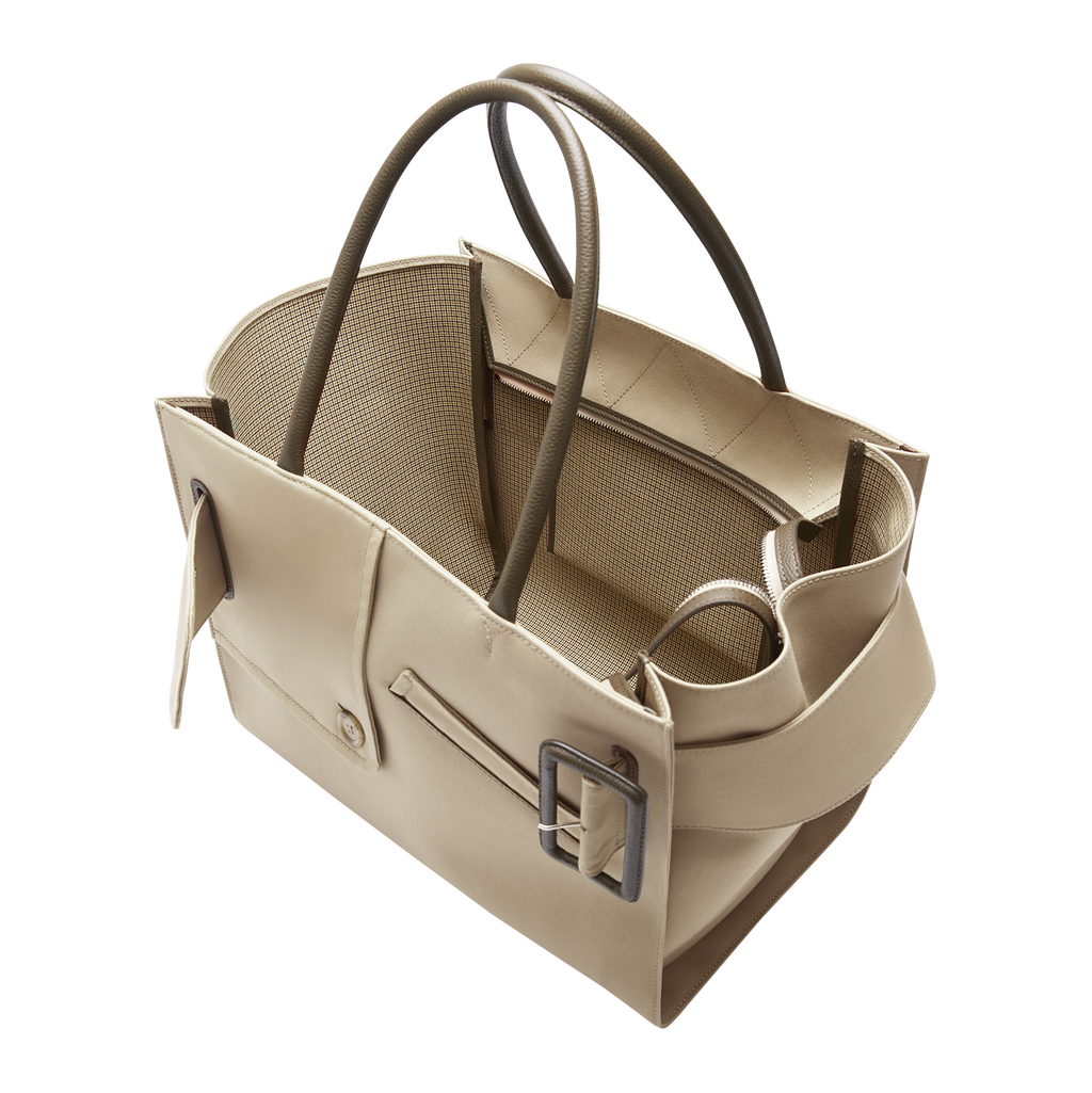 Water resistant cotton gabardine handbag with bonded cotton tartan pattern lining. An exterior angled trench coat pocket, interior pocket pouch, Oversized leather-wrapped buckle, Open top zip closure with twin calfskin carry handles.
