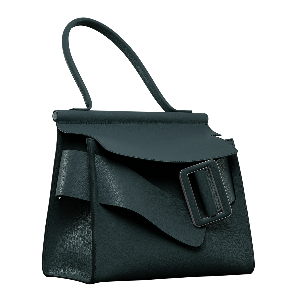 Supple natural grain calfskin leather handbag. Calfskin suede lining in Sea Moss color. Sea Moss edge paint. Oversized metal and leather buckle and leather belt with single carry handle. Front flap closure. Inside zipper pocket and pouch.