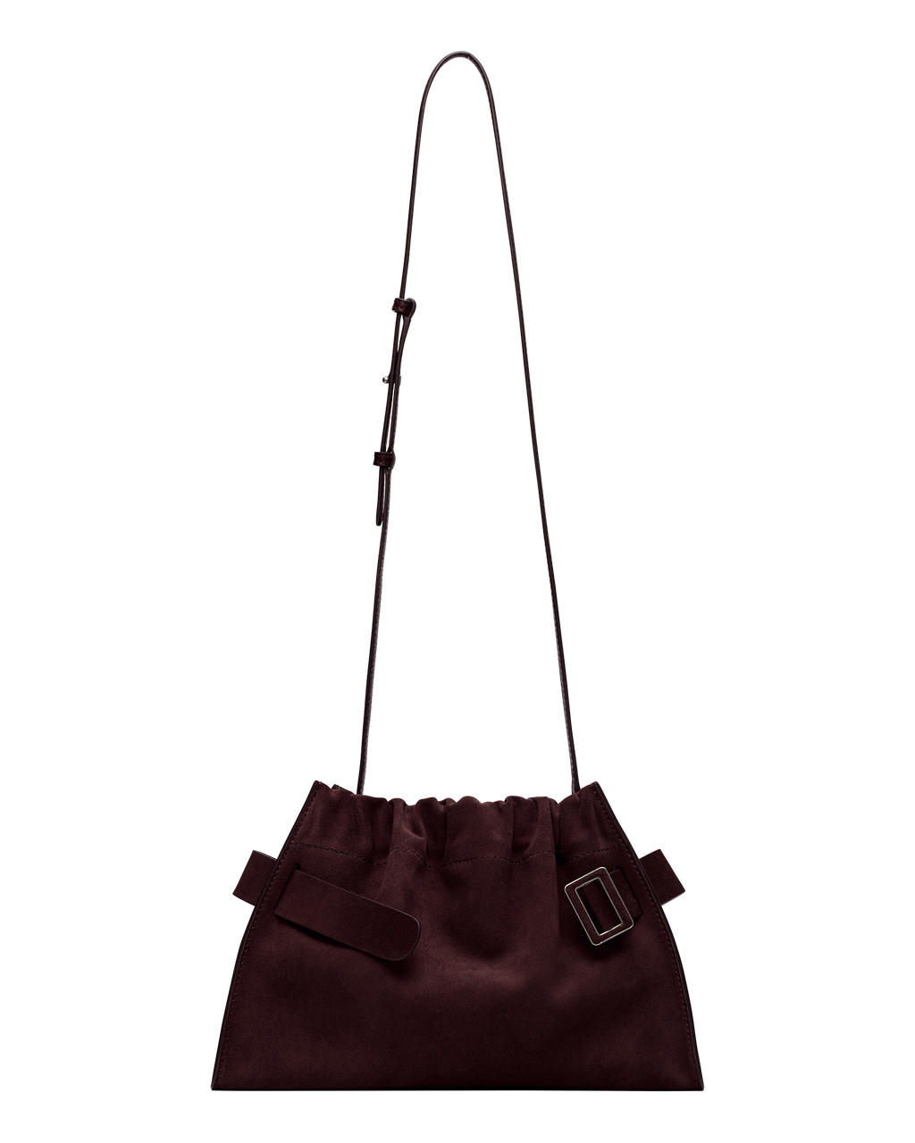 Calfskin suede leather pouch. Calfskin lining. Tone on tone edge paint. Metal and leather buckle and leather belt. Adjustable two way leather shoulder strap.