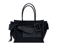 ECONYL® regenerated nylon and leather handbag with zip closure. Oversized metal and leather buckle. Leather belt with twin carry handles. Exterior front and rear leather pocket Interior leather pockets. *ECONYL® regenerated nylon is a sustainable fiber obtained through an innovative regeneration process. Unlike traditional Nylon, ECONYL® regenerated nylon can be recycled, recreated, and remoulded again and again.