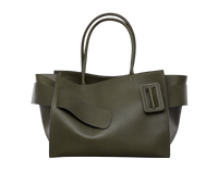 Supple natural grain calfskin leather handbag. Alcantara suede lining. Darker tone edge paint. Oversized metal and leather buckle and leather belt with twin carry handles. Open top with zip closure. Inside zipper pocket and pouch.