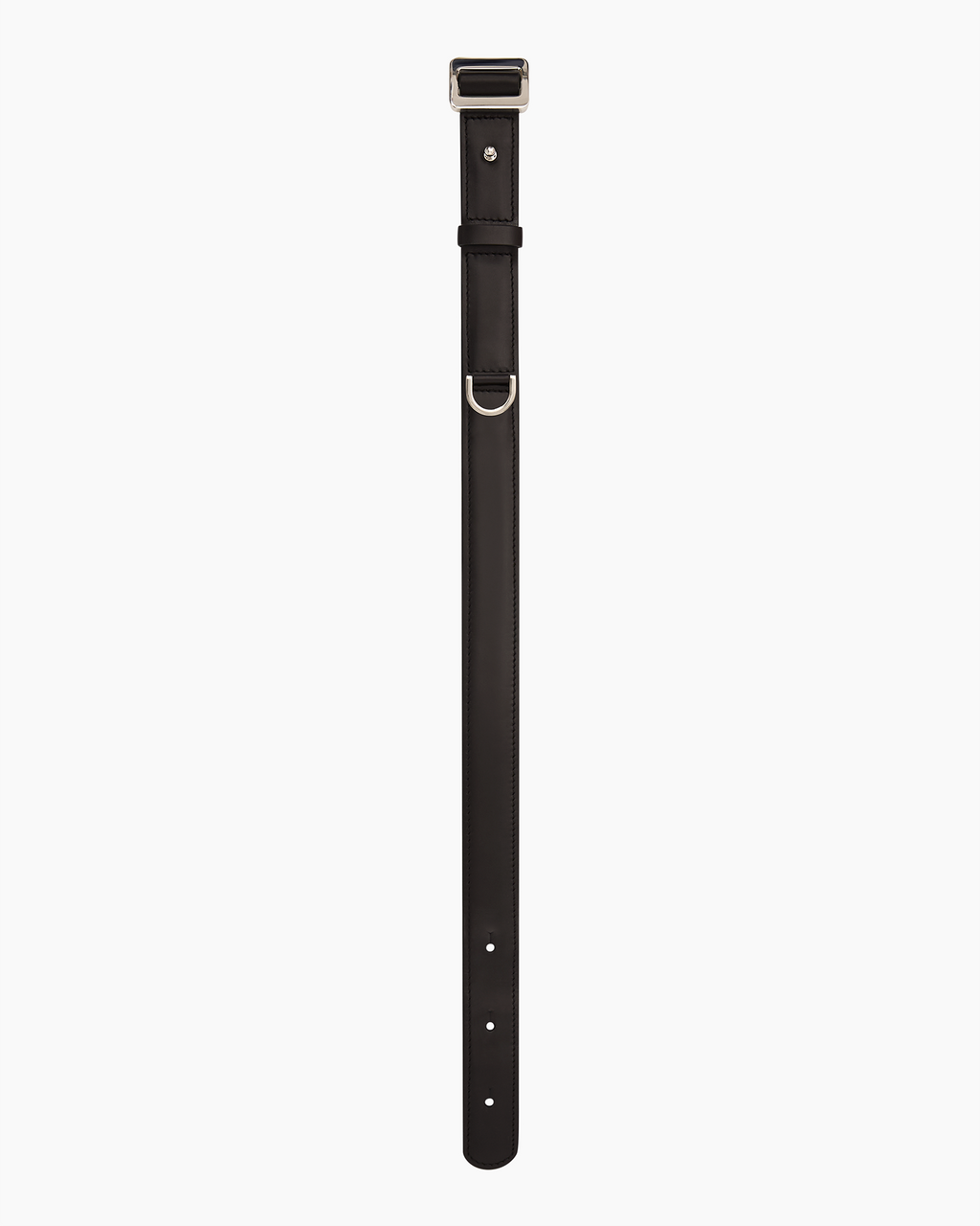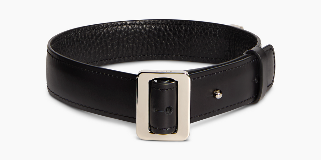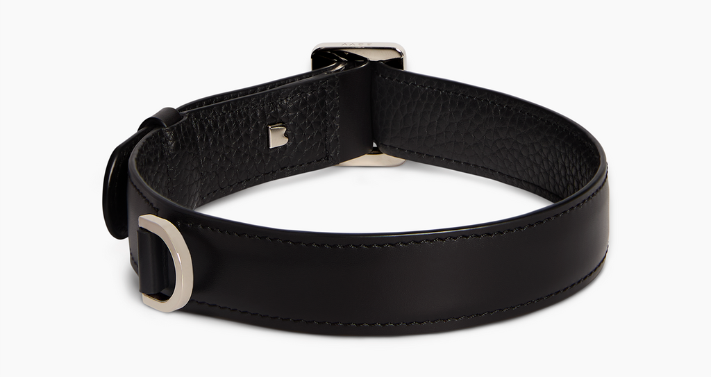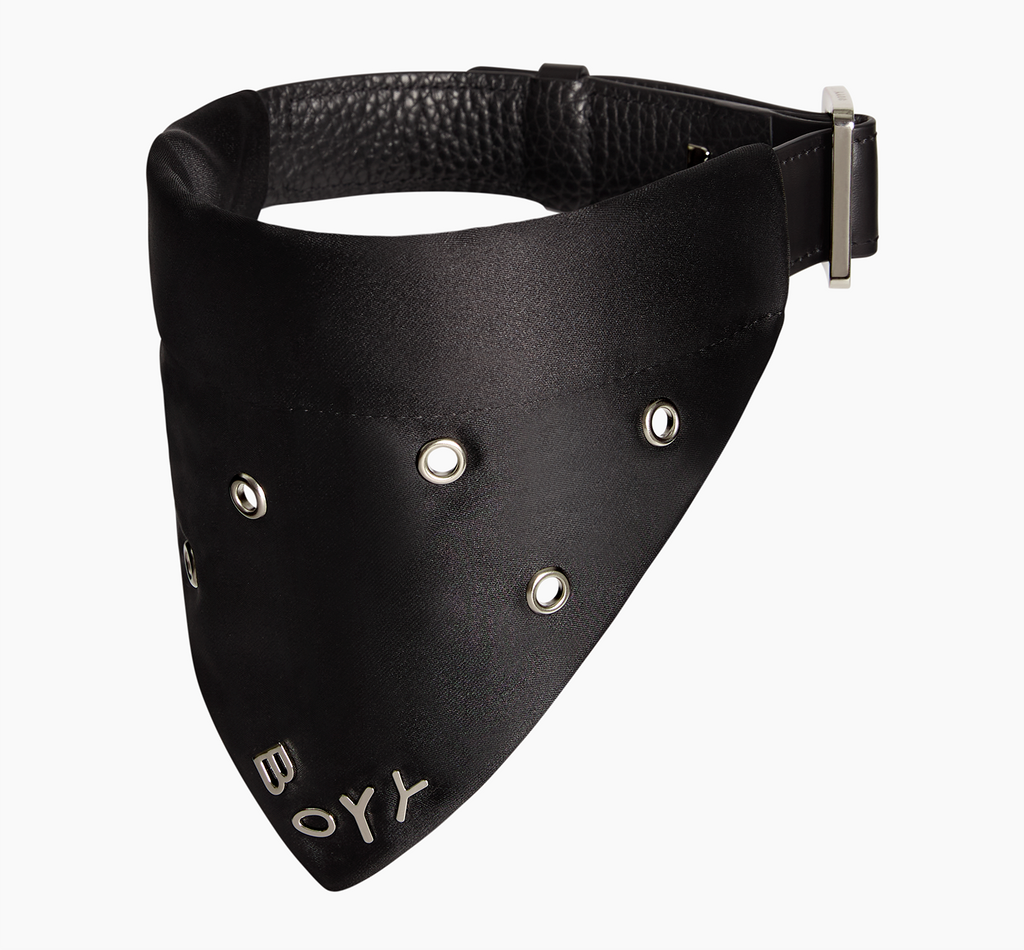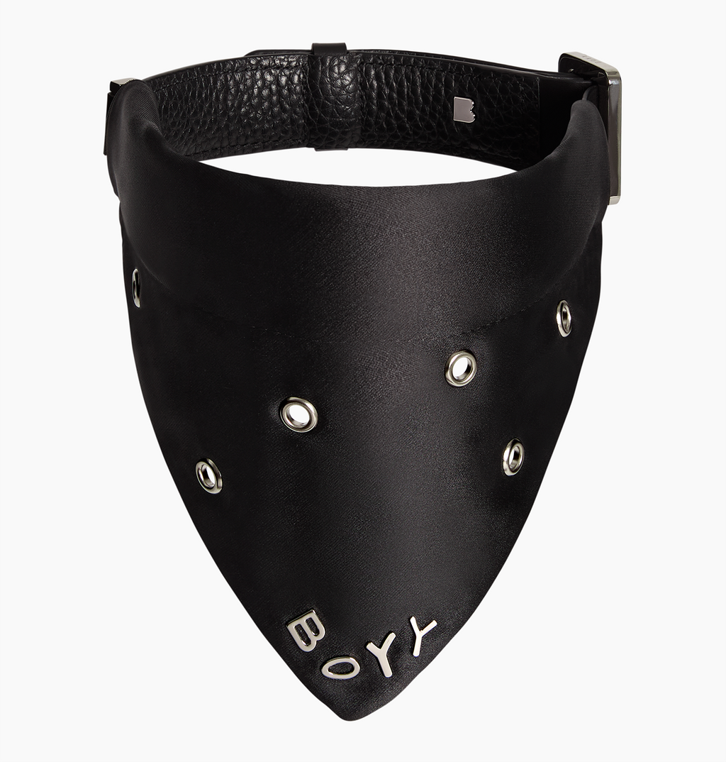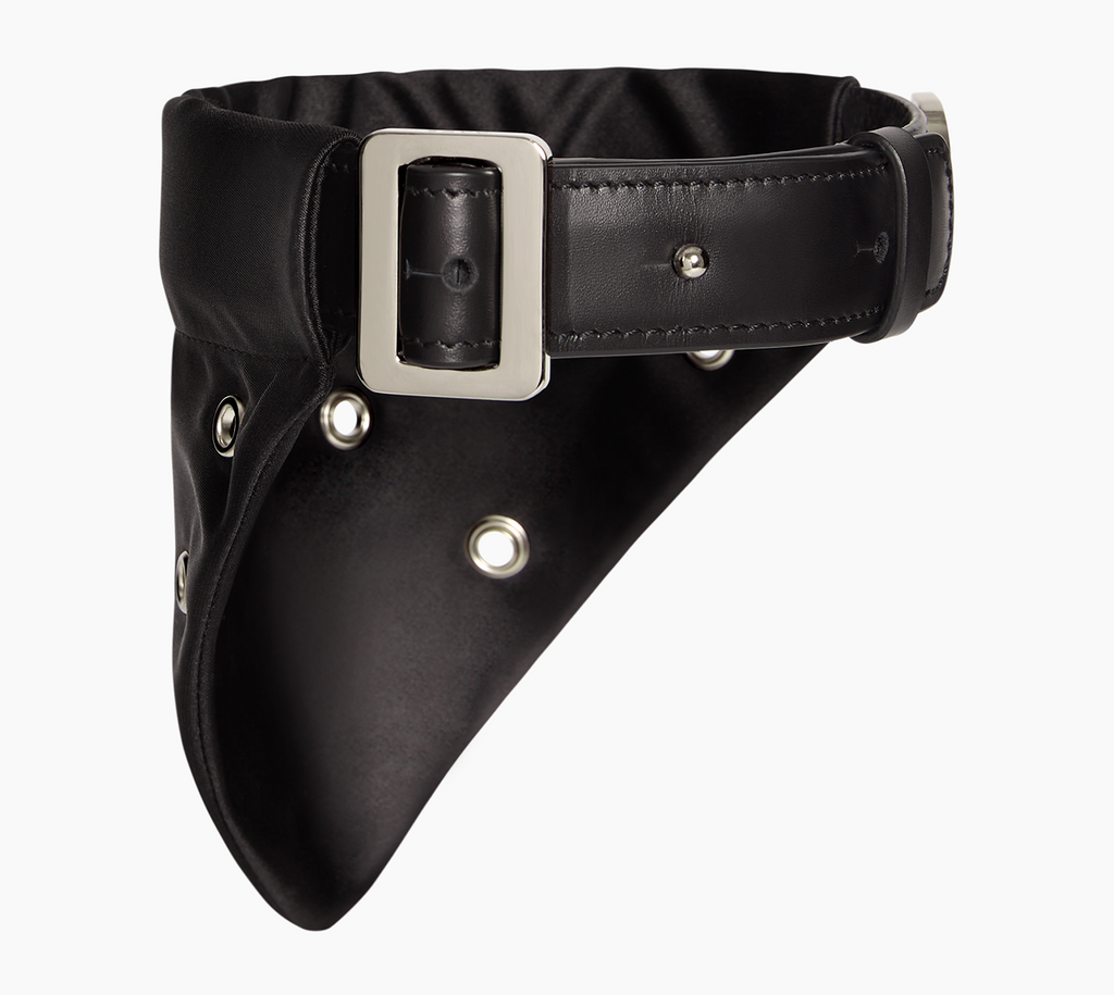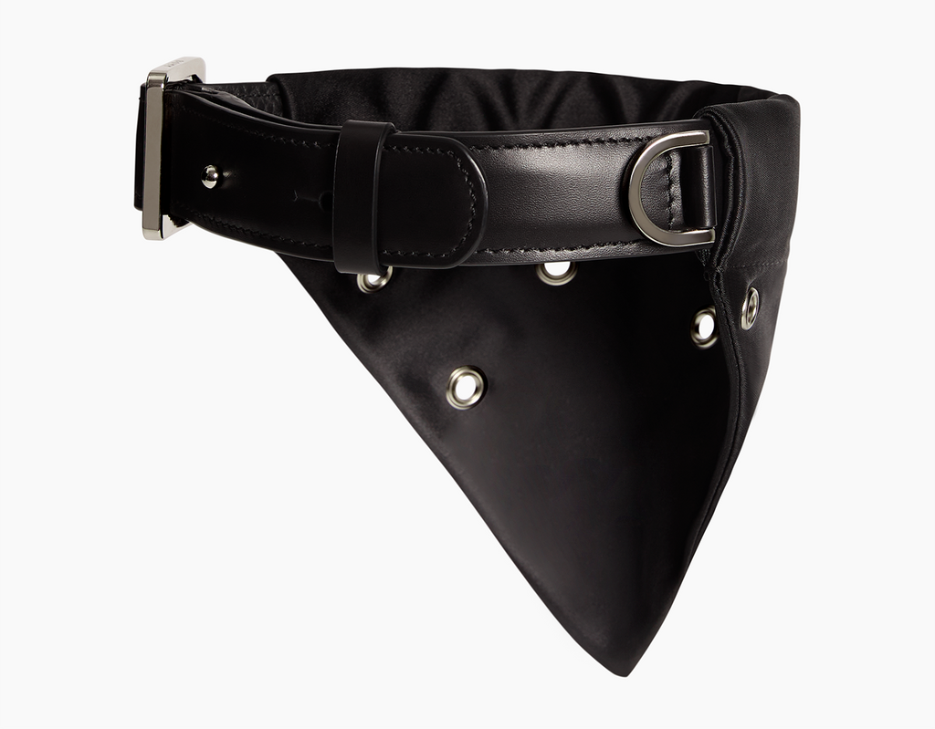 Adjustable calfskin leather dog collar with a ECONYL® regenerated nylon scarf and eyelets feature.