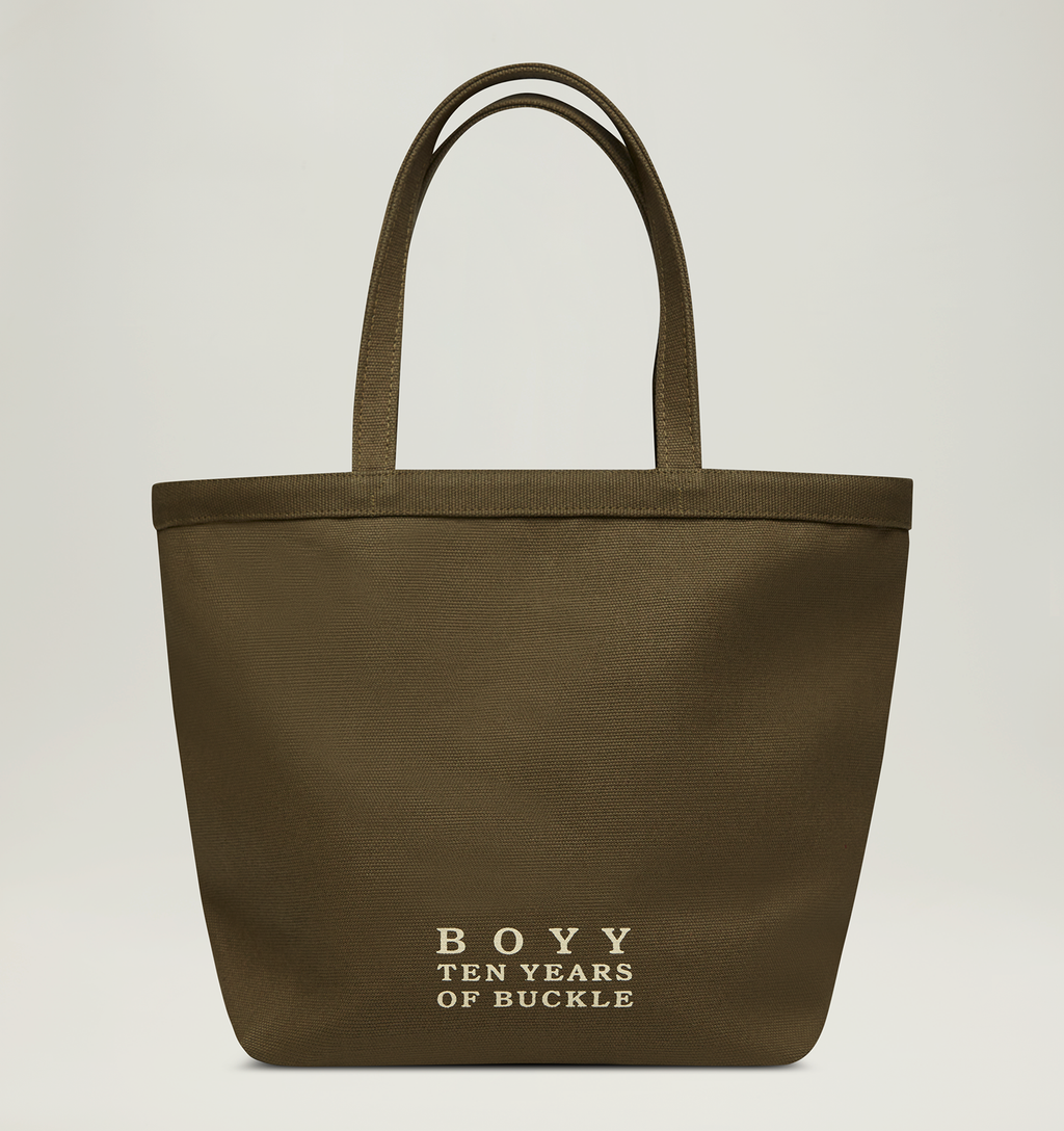Cotton tote bag featuring a print BOYY 10 years of Buckle logo. Designed exclusively for the 10 Years of Buckle Exhibition.
