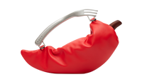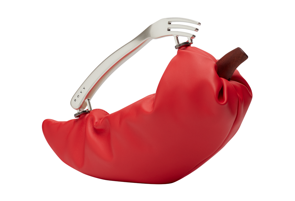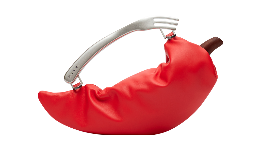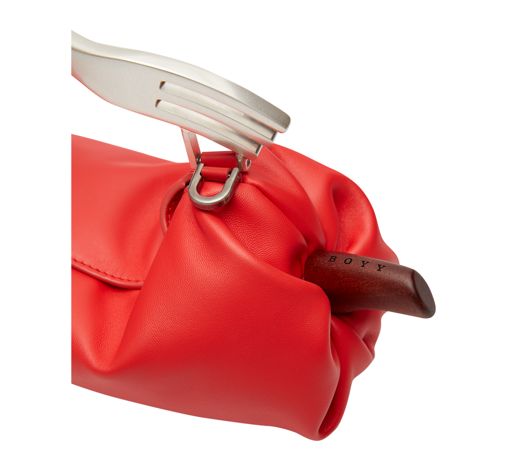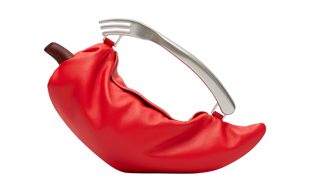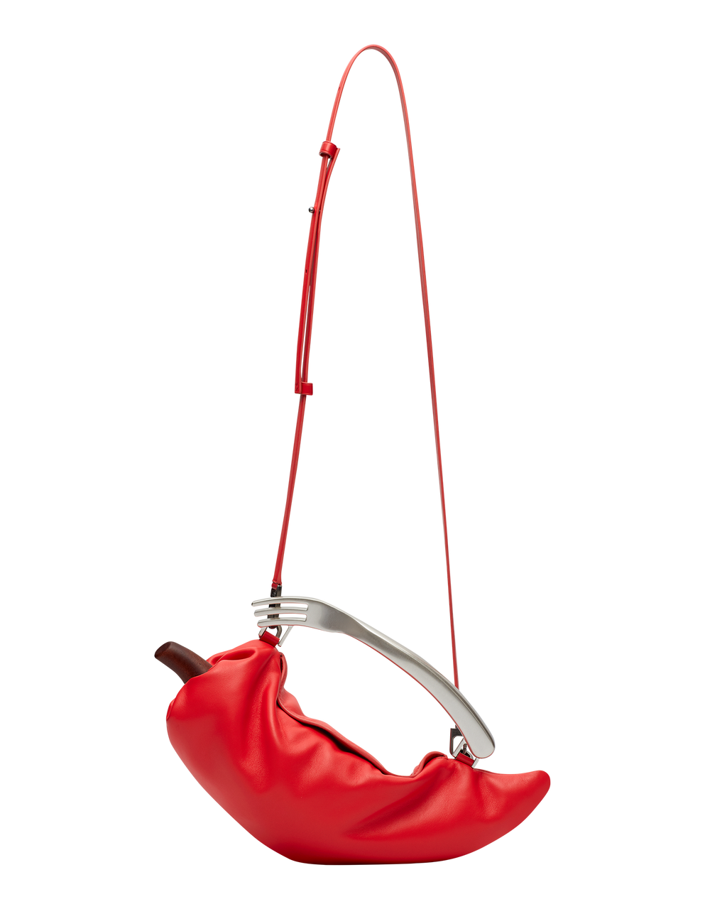 Lambskin bag inspired by a chili pepper. Silver fork-shaped handle. Wooden stem detail. Magnetic flap closure. Adjustable and detachable crossbody strap.