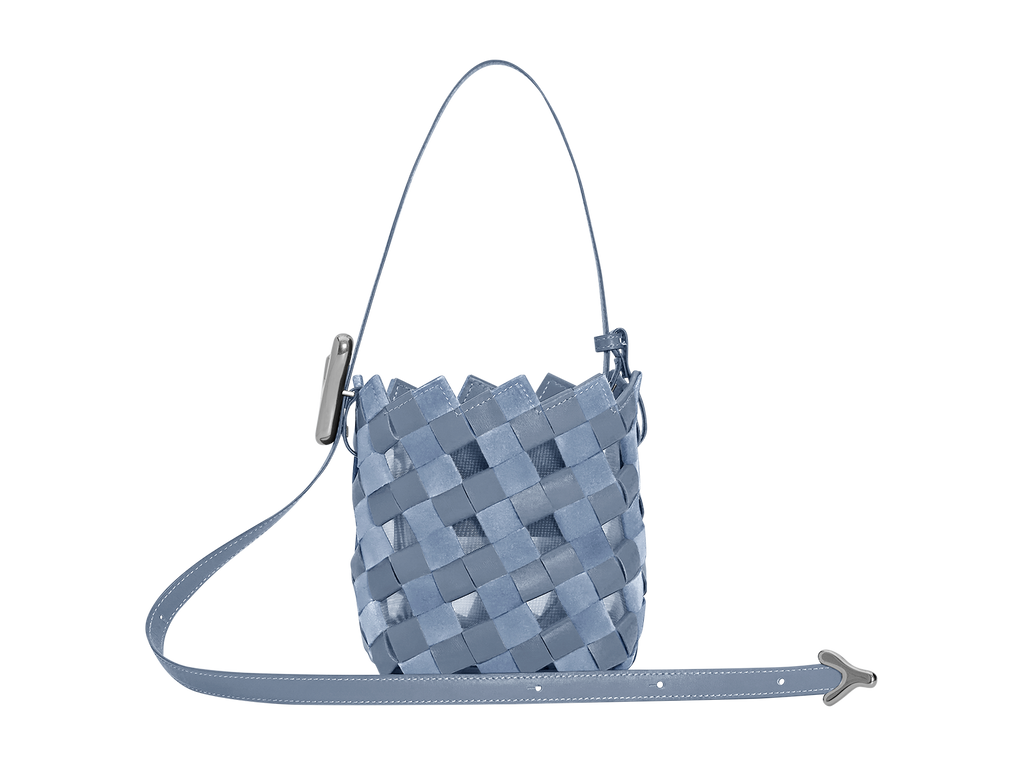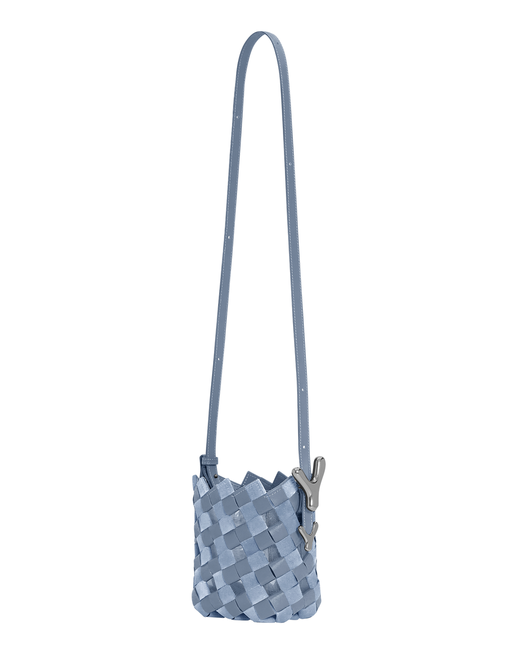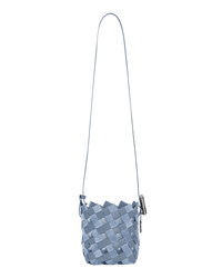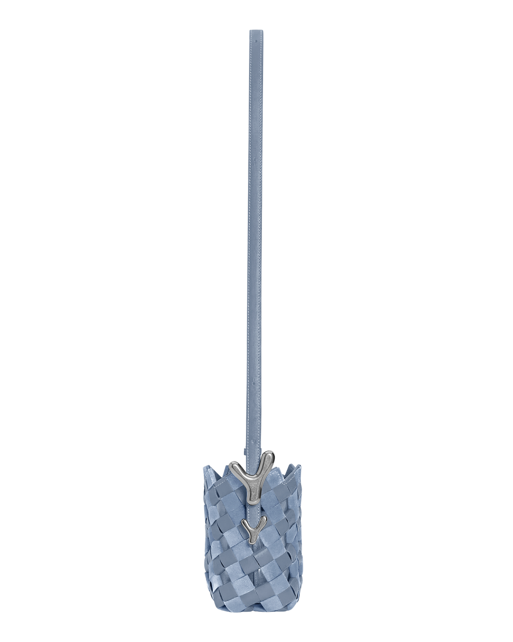 Woven calfskin leather bucket bag. Mesh lining. Open top with silver YY hardware. Inside pocket. Adjustable shoulder strap.