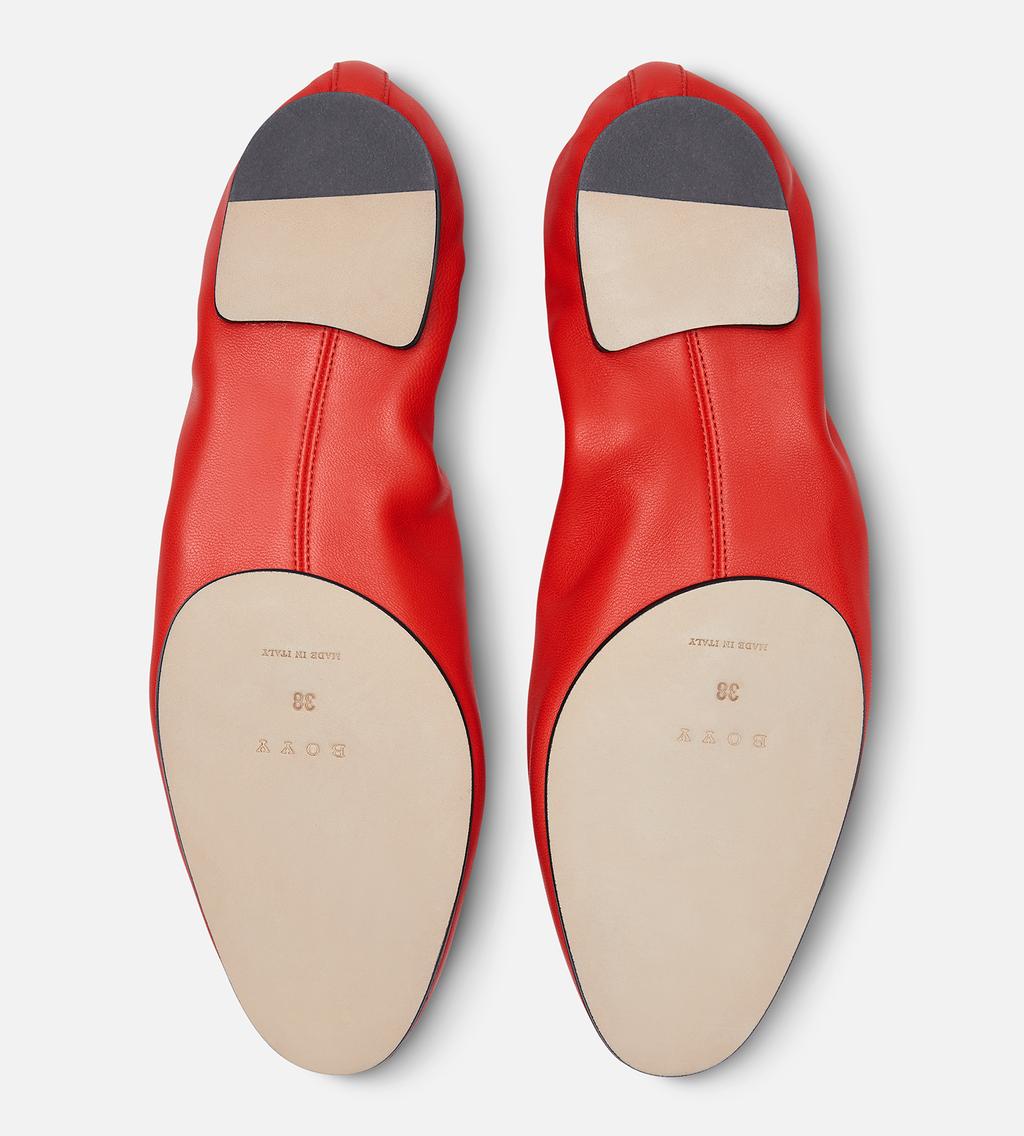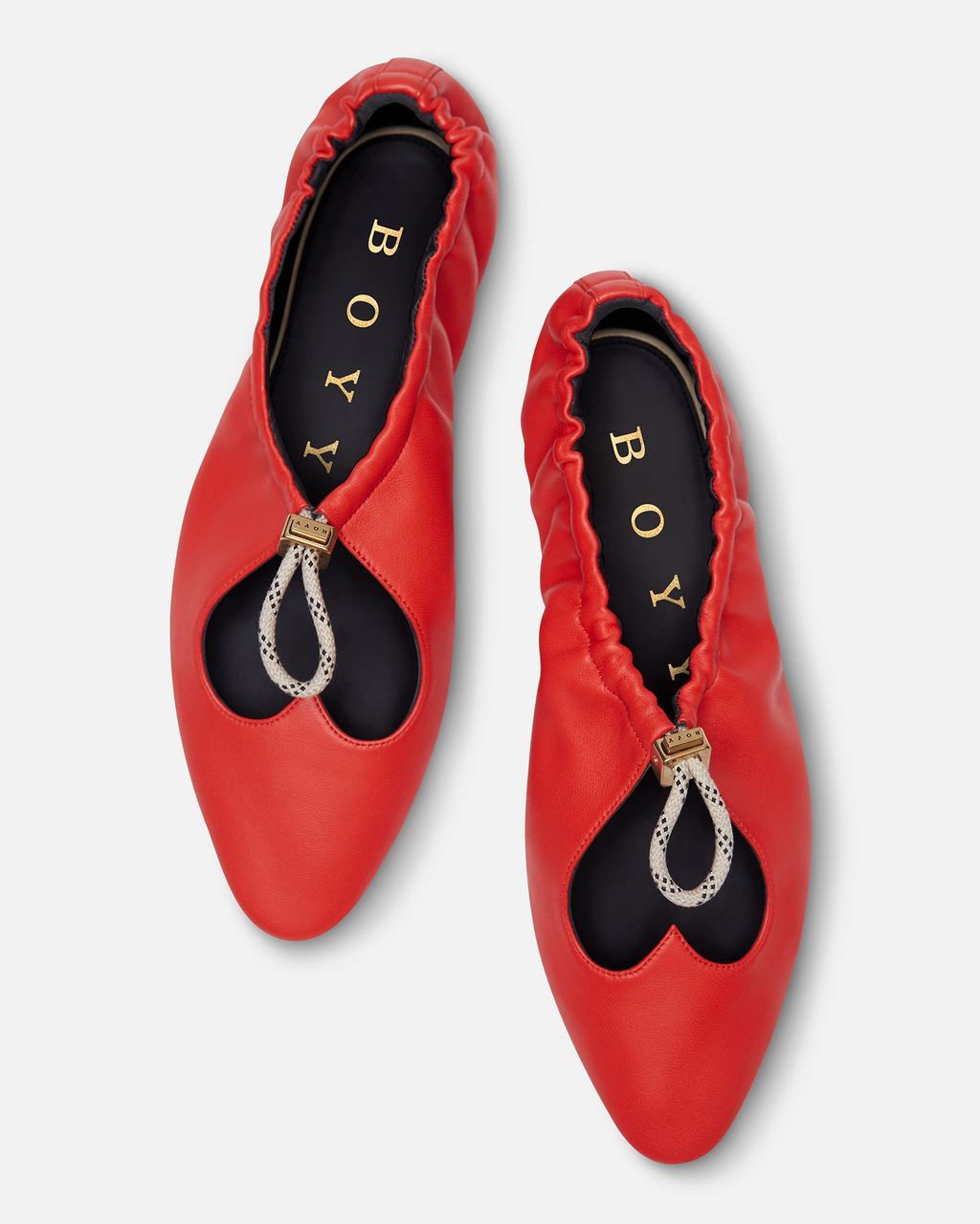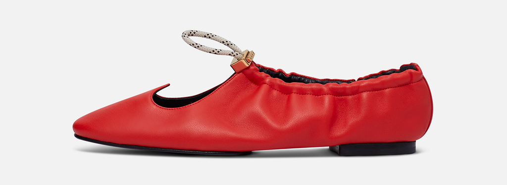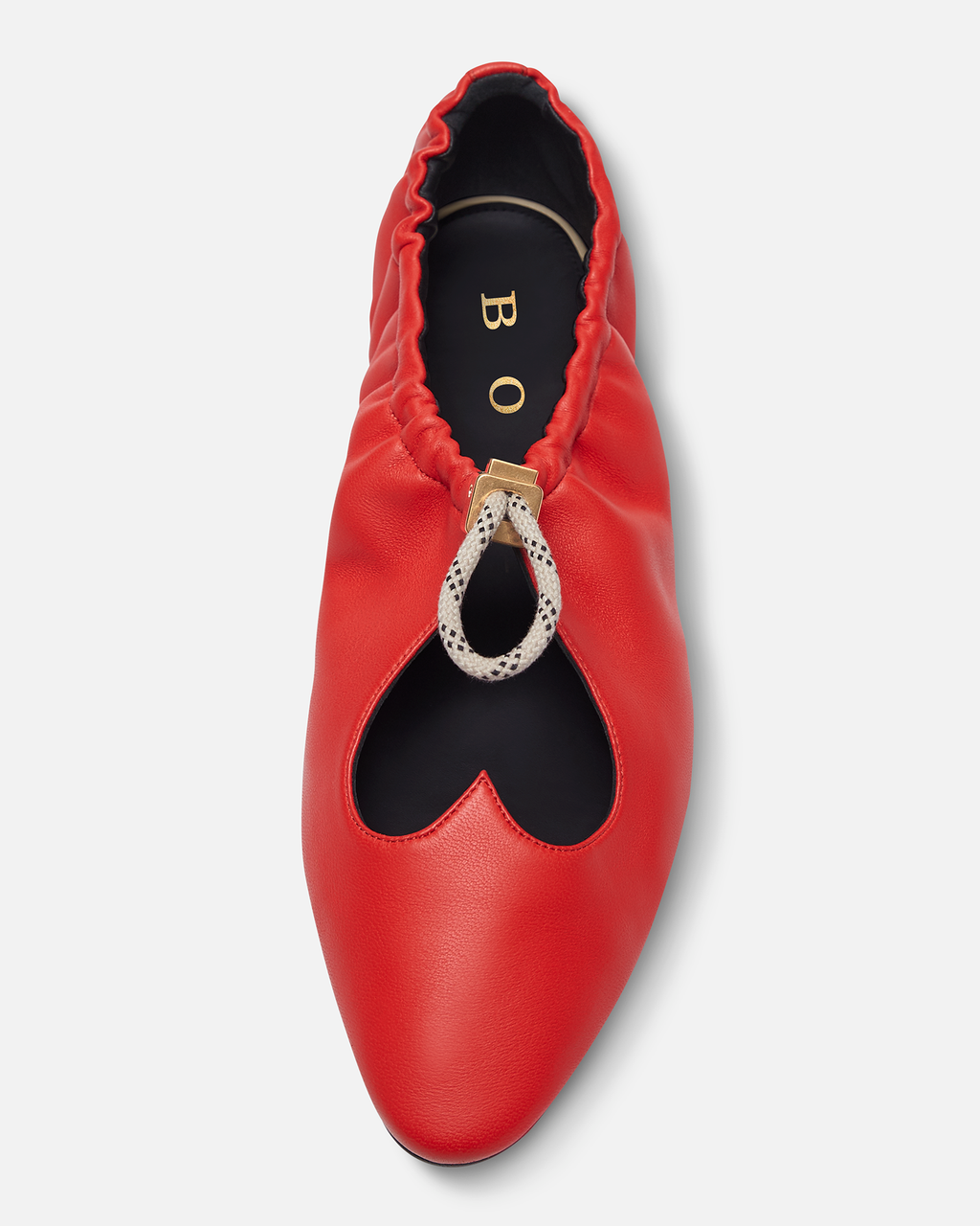 Lambskin ballerina shoe. Lambskin upper and lining. Calfskin insole . Heart-shaped design detail. Silk woven adjustable rope with hardware detail for a customizable fit.