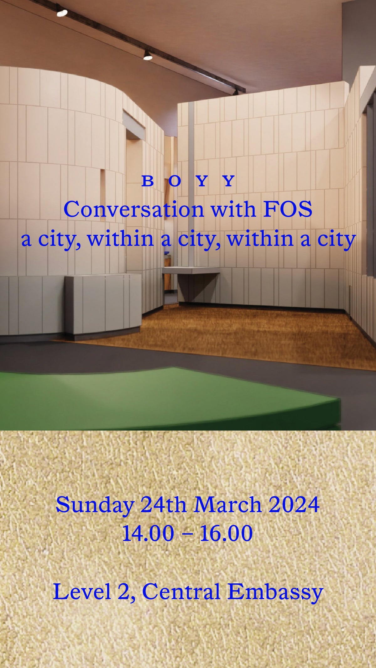 During the conversation with FOS, he will exchange key aspects in driving creativity and challenging the conventional within the vision for the embassy space, conceived as "a city, within a city, within a city". Additionally, together, BOYY and FOS collaboratively sparked a creative journey.