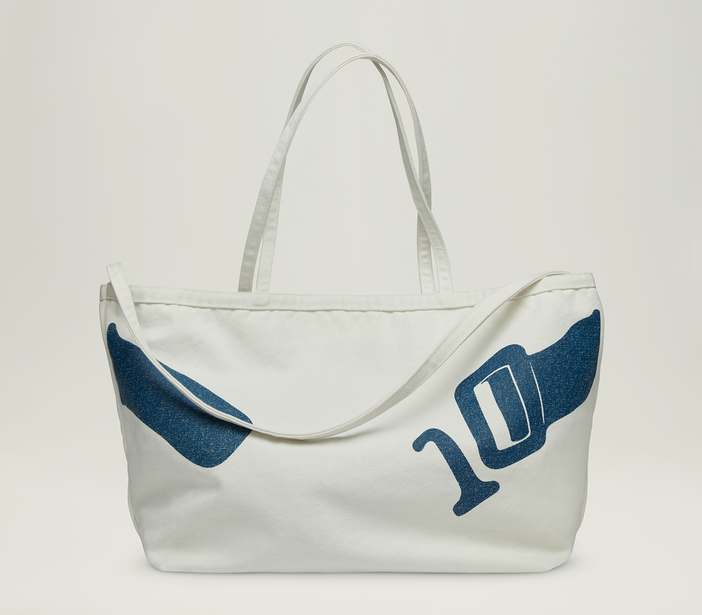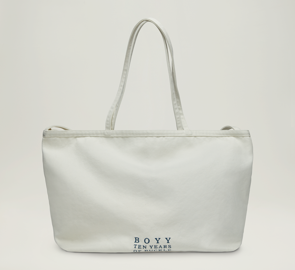 A washed cotton tote bag featuring a water-based screen print BOYY 10 years of Buckle logo. Designed exclusively for the 10 Years of Buckle Exhibition.