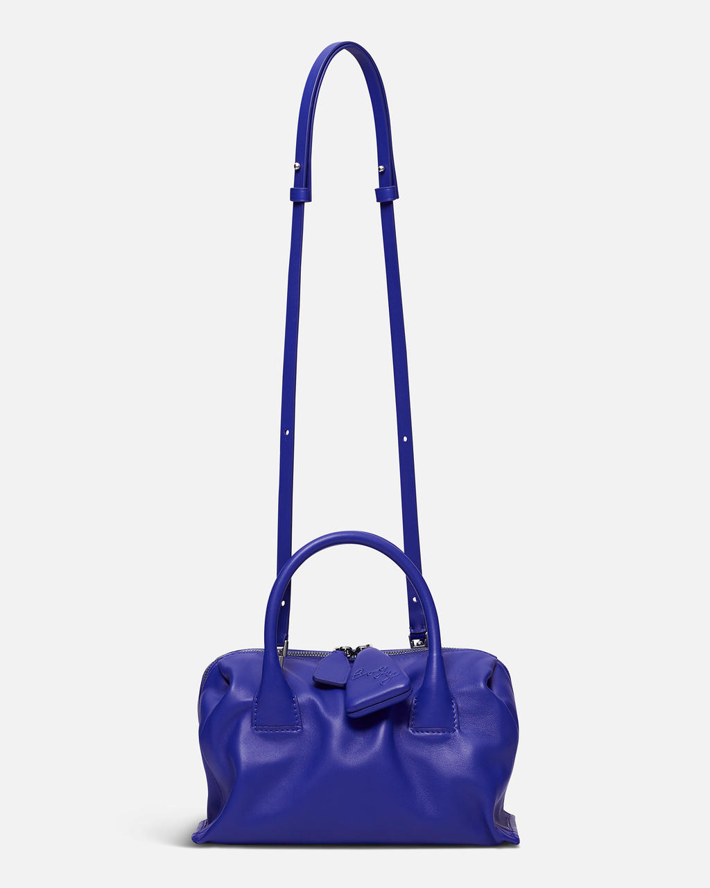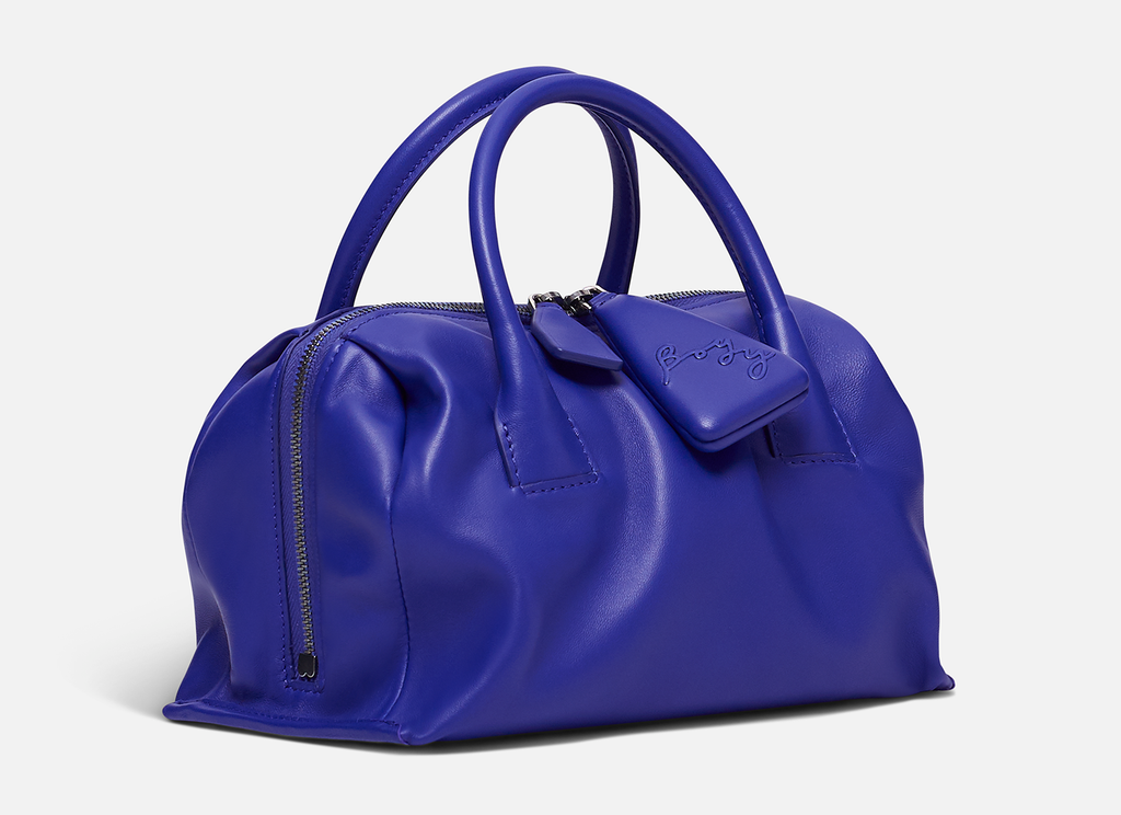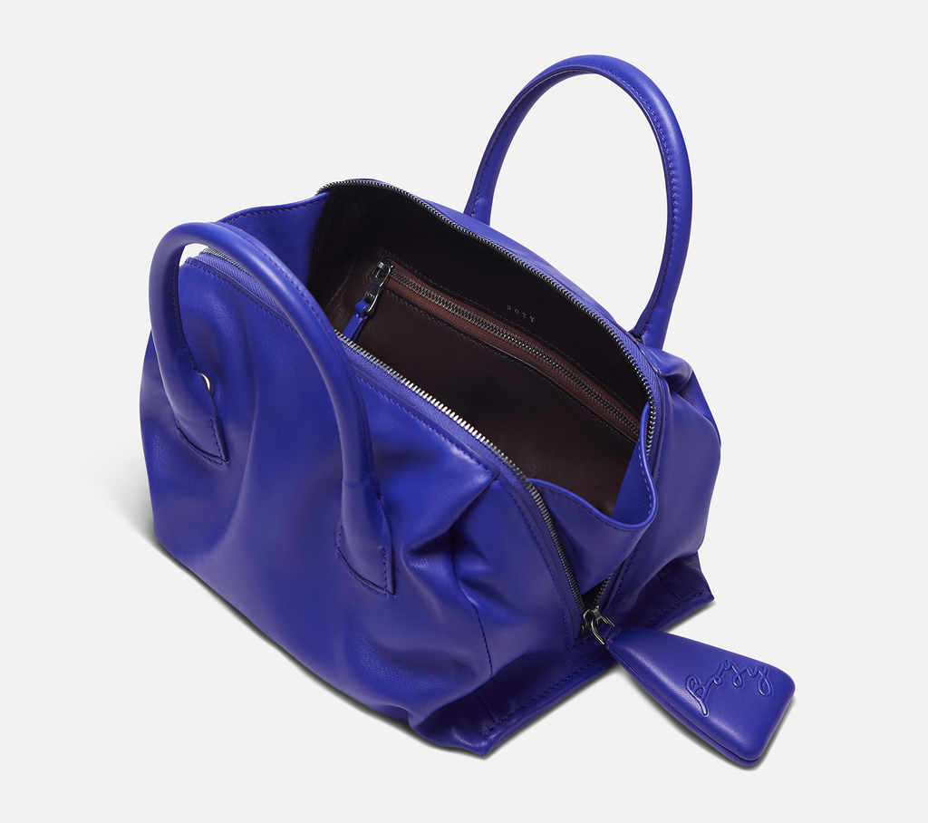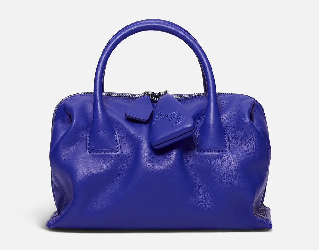 Slouchy lambskin handbag with lambskin lining. Twin carry handles. Zipper closure with an oversized zip puller embossed with the BOYY script logo. Interior features one zip pocket and one card pocket. Metal feet at the base. Adjustable and detachable leather shoulder strap.