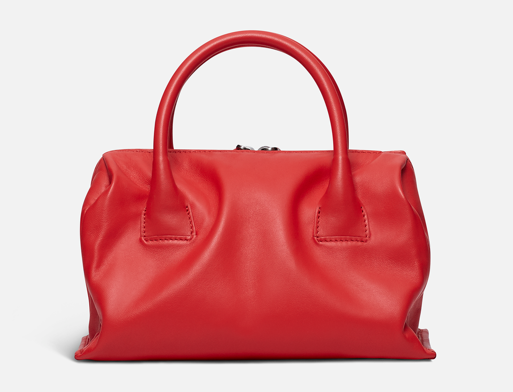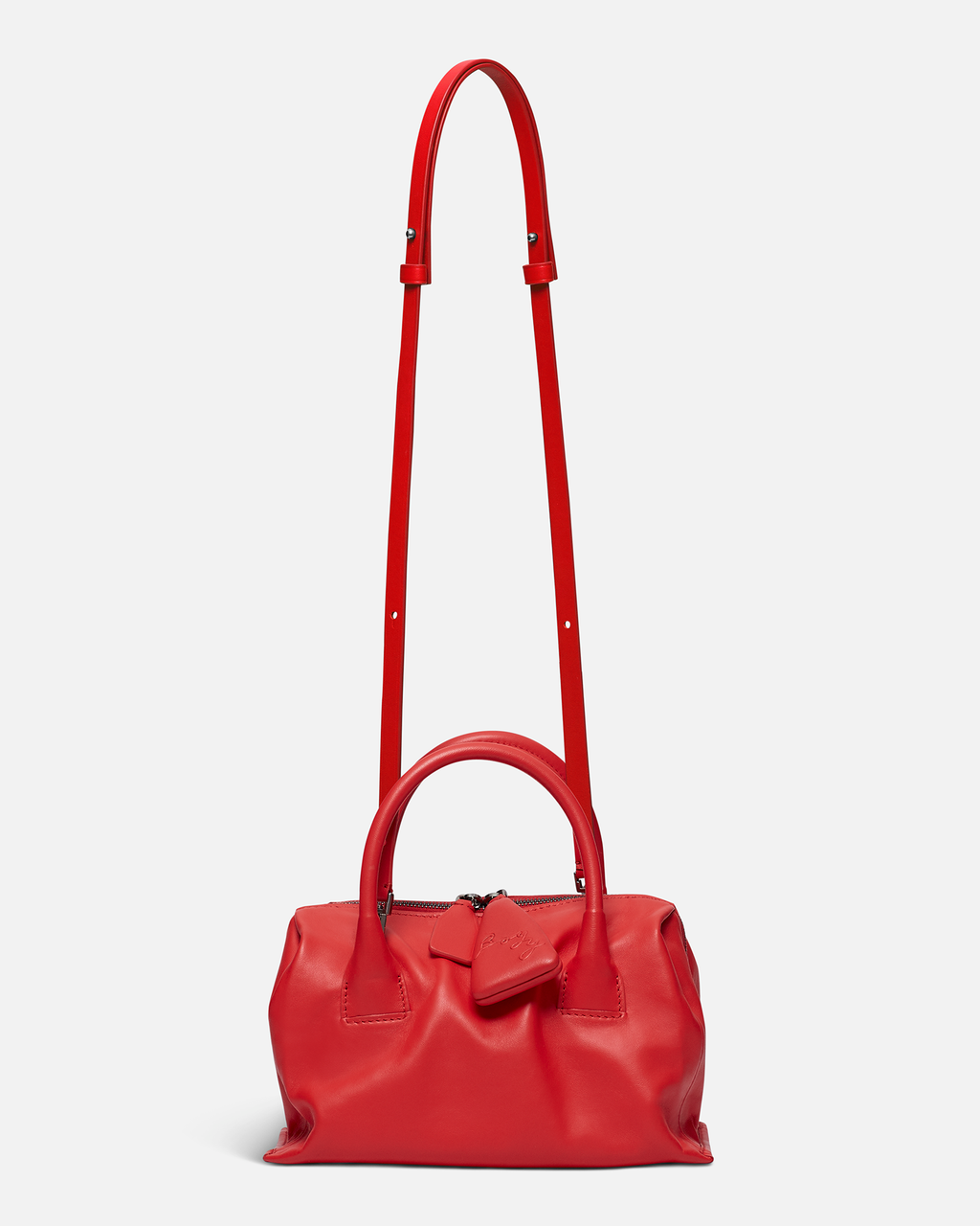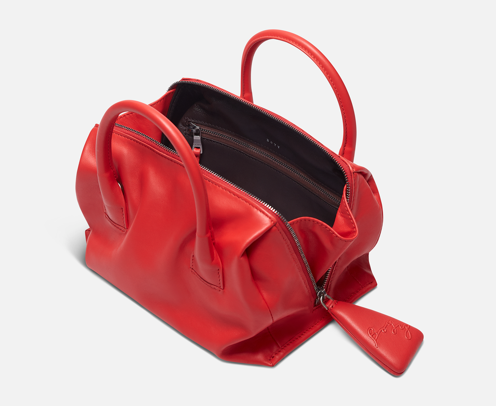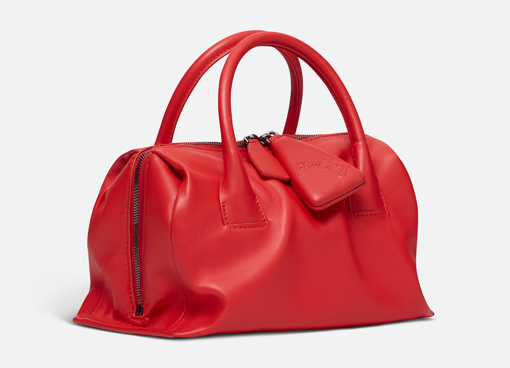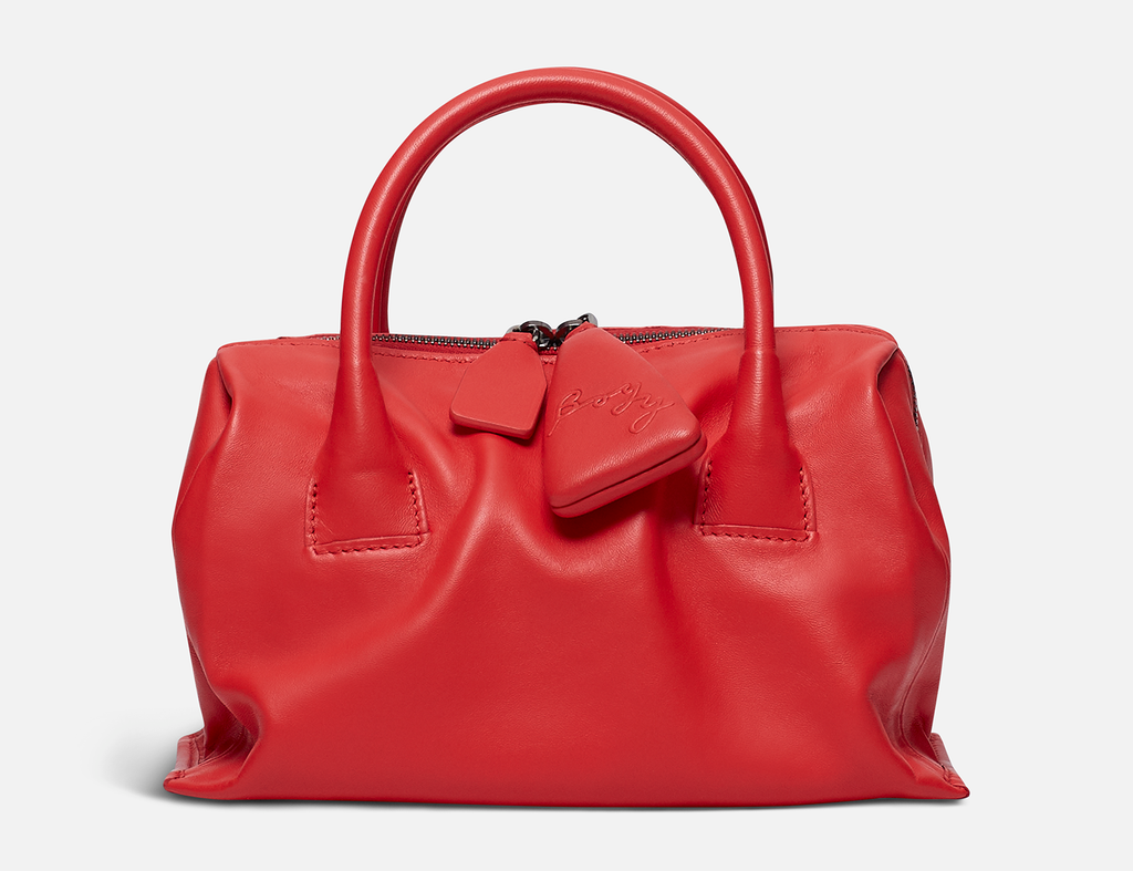 Slouchy lambskin handbag with lambskin lining. Twin carry handles. Zipper closure with an oversized zip puller embossed with the BOYY script logo. Interior features one zip pocket and one card pocket. Metal feet at the base. Adjustable and detachable leather shoulder strap.