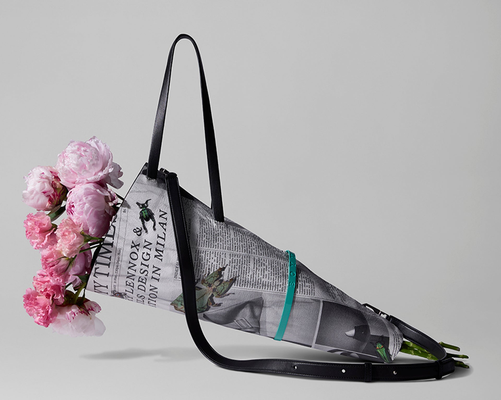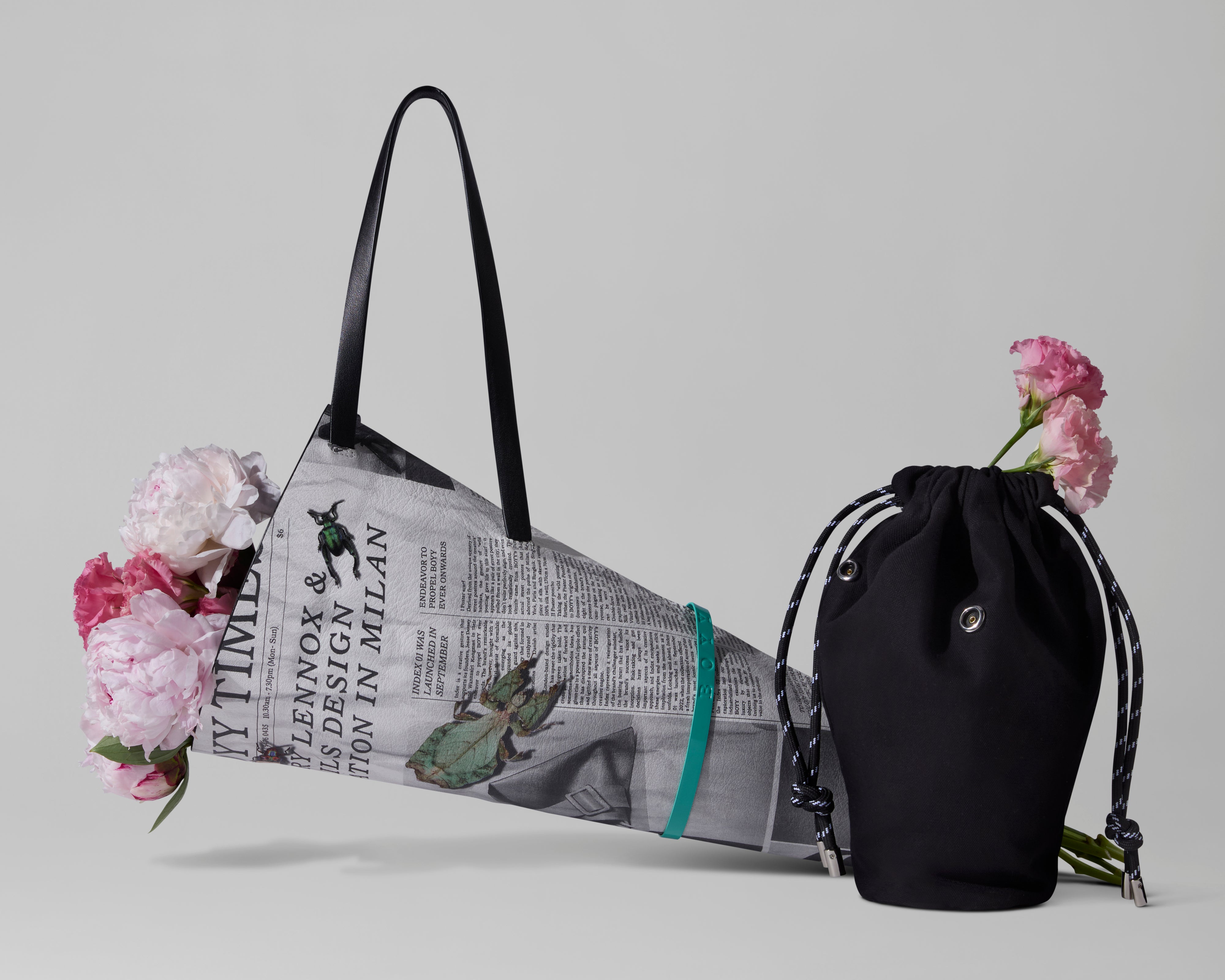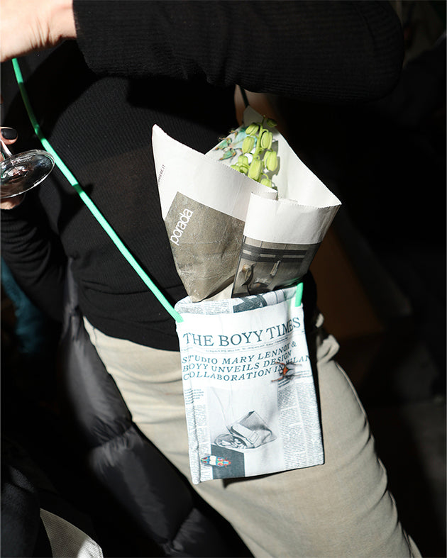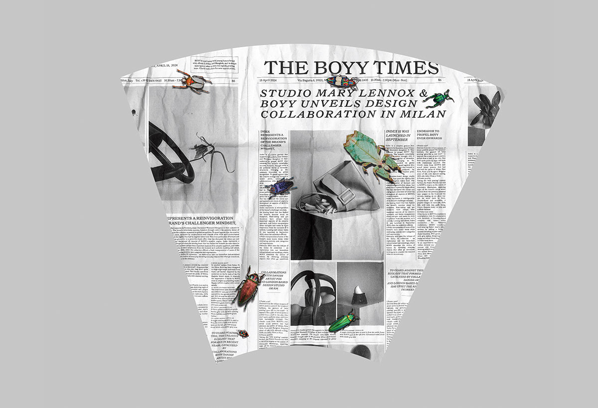 Independent and multidisciplinary designer brand BOYY, teams up with Renowned international botanical design studio, Studio Mary Lennox, to launch a playful yet practical project; A bag, dedicated to the carrying of a flower bouquet. "The Gazette Bag” is made of newspaper-printed Lambskin, adorned with photographic images produced in collaboration between BOYY and Studio Mary Lennox along with a group of playful bugs which unknowingly go about their business within the print. The limited edition bag will be launched exclusively at the BOYY Milan flagship during 2025 Milan Design Week, with an in-store special activation and installation by Studio Mary Lennox. In conjunction is the scaled down “gazette charm”, to carry a singular flower as a daily expression as well as the “gazette sac” , a printed canvas bag with cross body strap to carry your everyday needs.