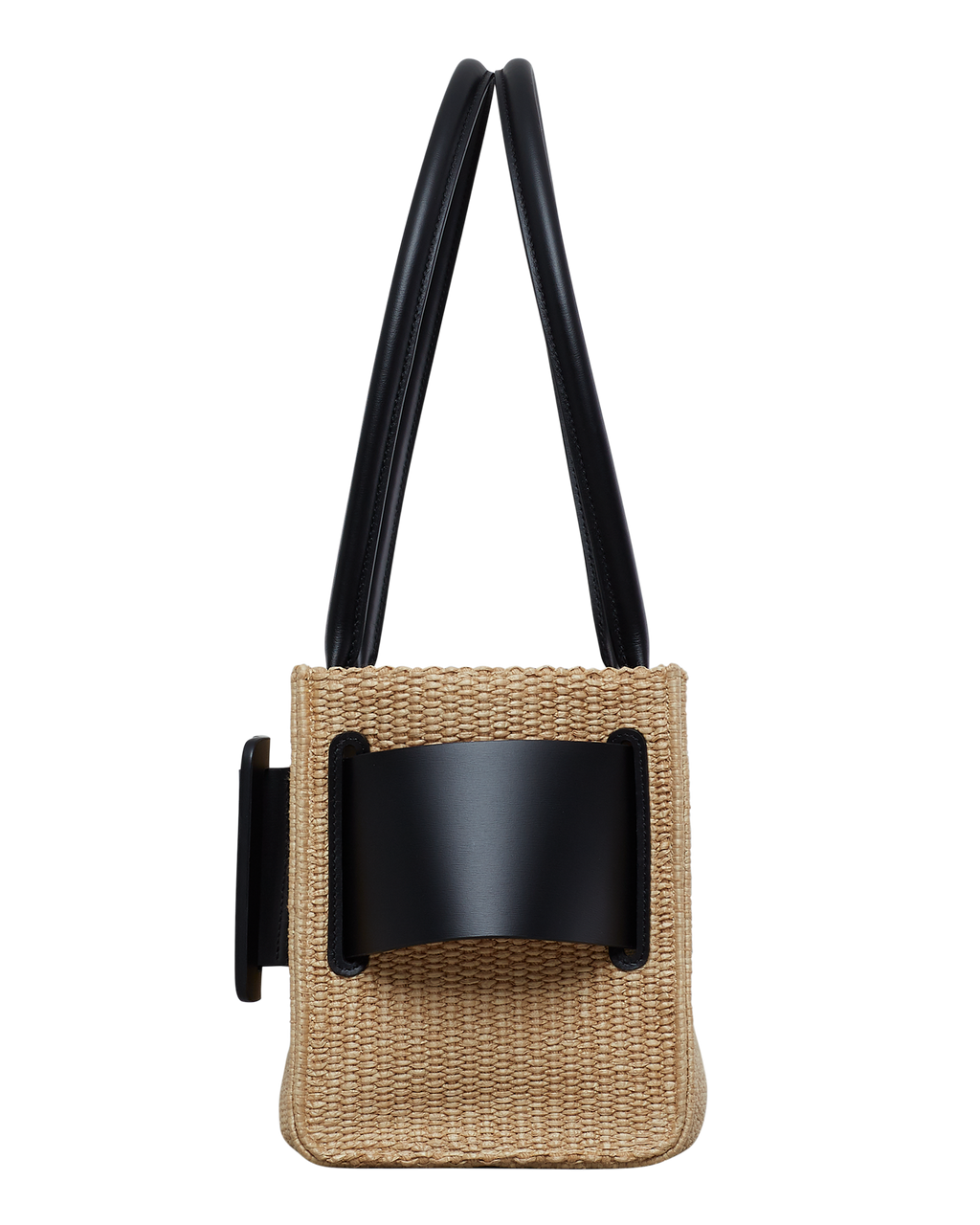 Natural raffia BOYY BOBBY soft 23 luxury handbag made of raffia with cotton lining. Features a relaxed, modern silhouette, extended over the shoulder handles with an oversized belt, buckle, and zipper closure 3/4
