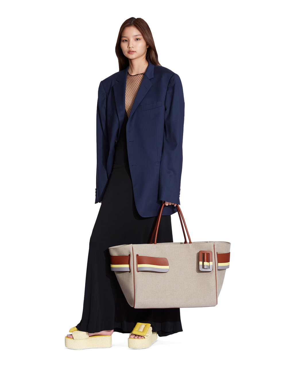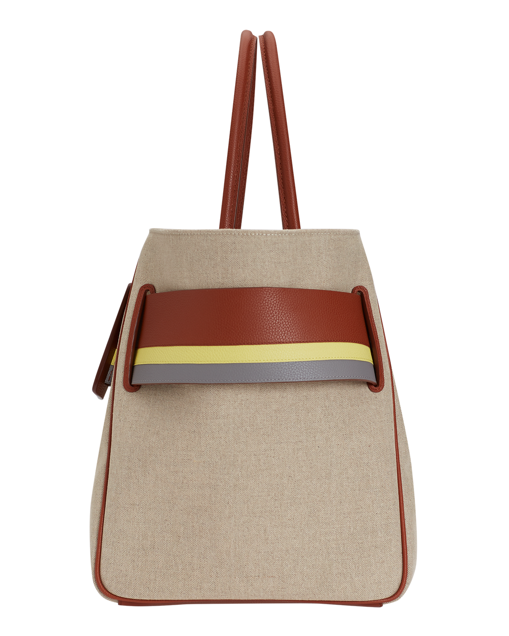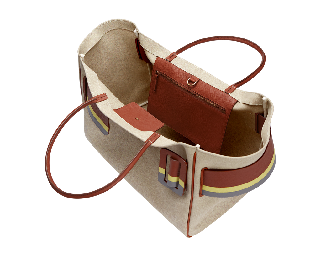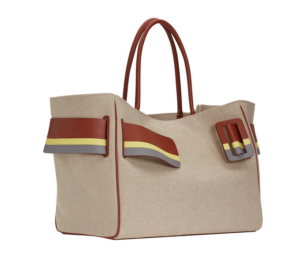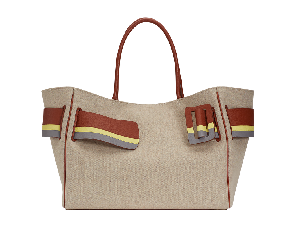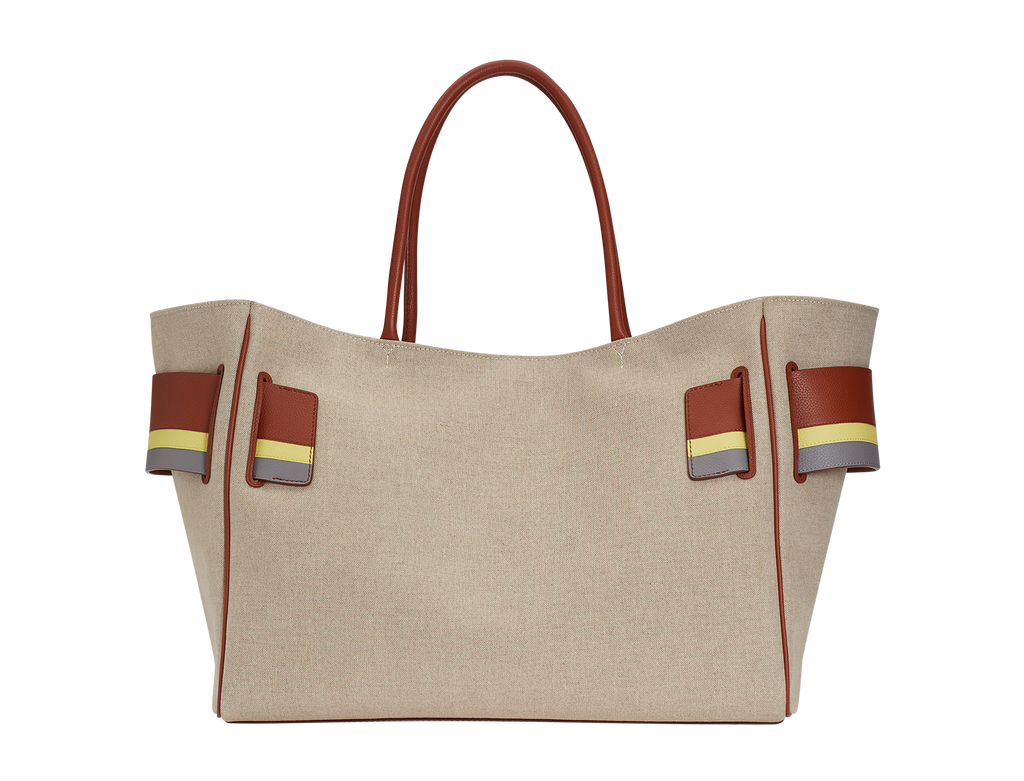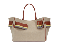 Canvas handbag with canvas lining. Leather edge piping with metal hook fastener. Interior leather pocket. Oversized leather buckle and leather belt with twin carry handles.