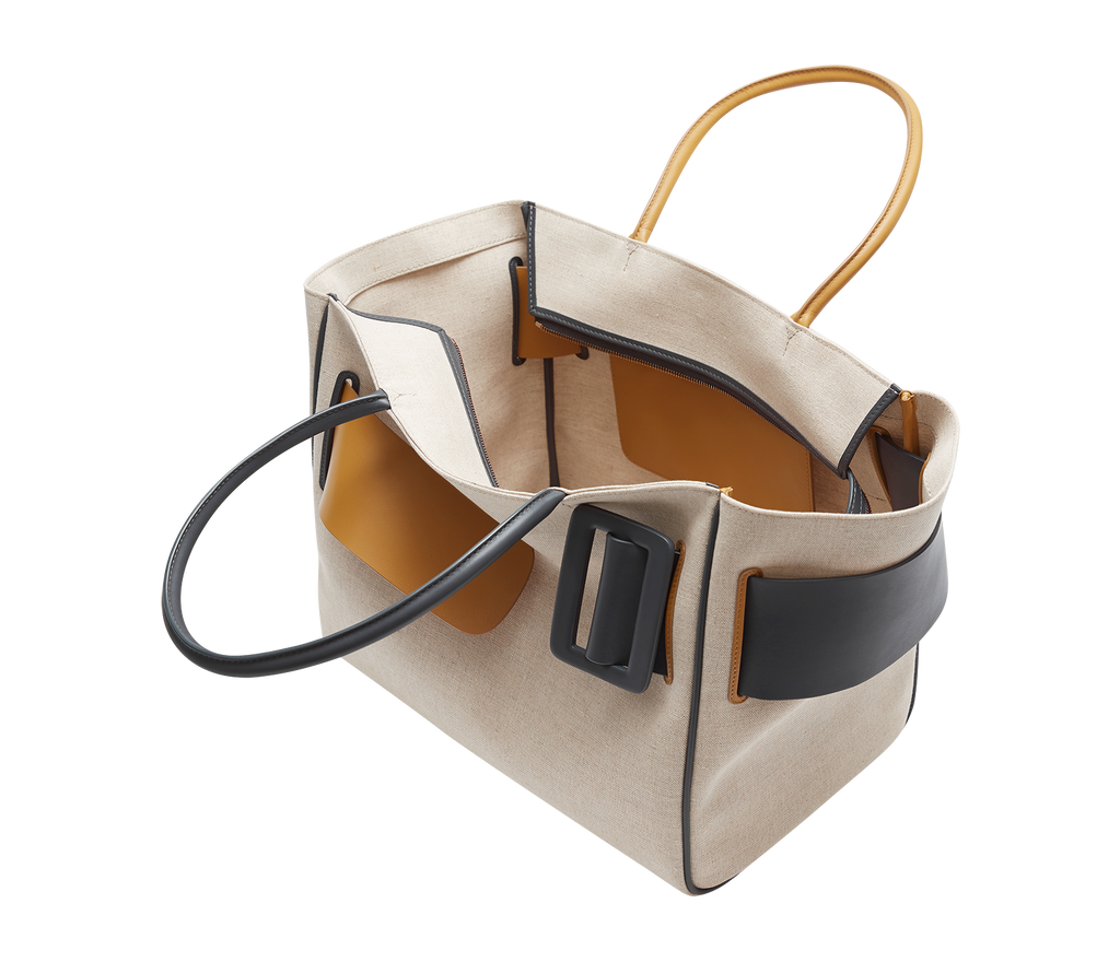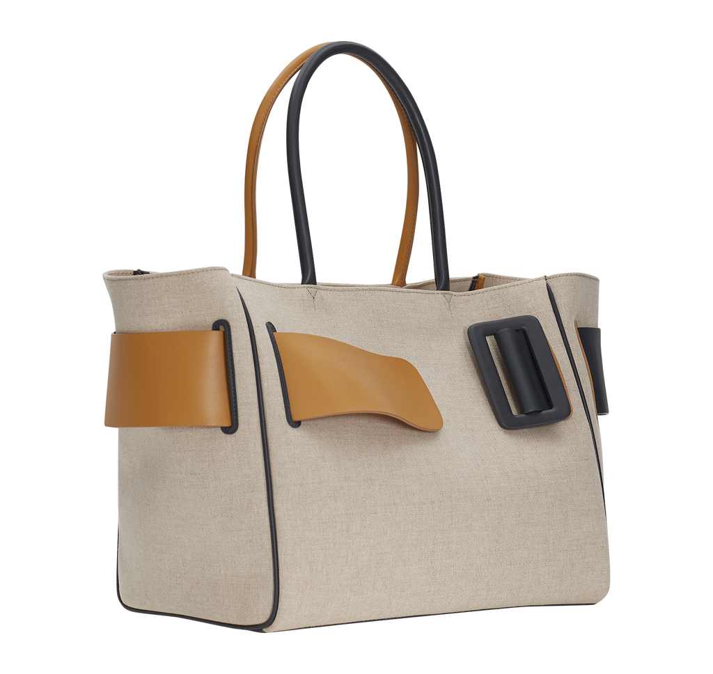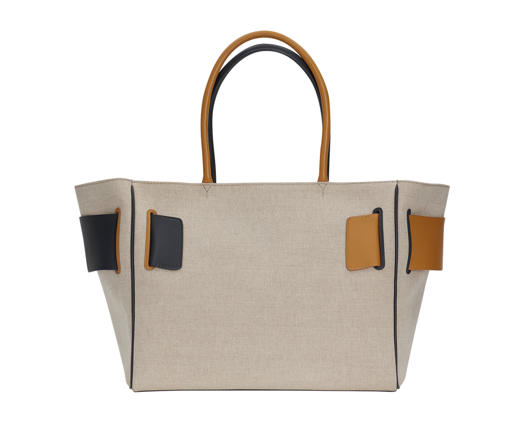 Canvas handbag with canvas lining. Leather edge piping. Interior leather pocket. Oversized leather buckle and leather belt with twin carry handles.
