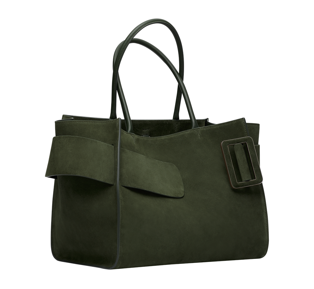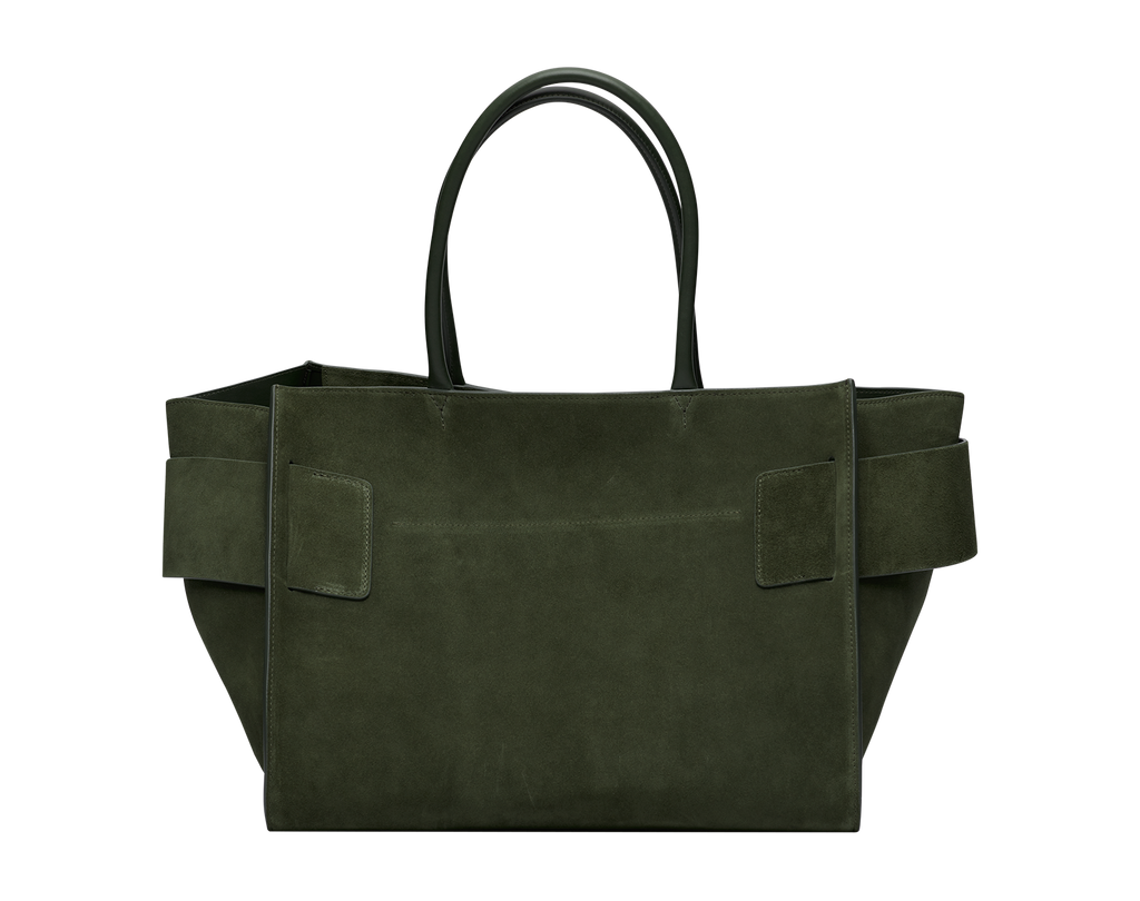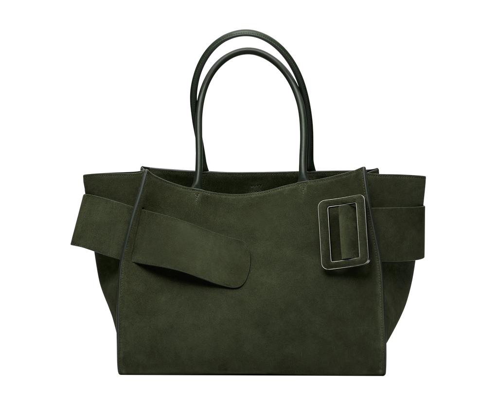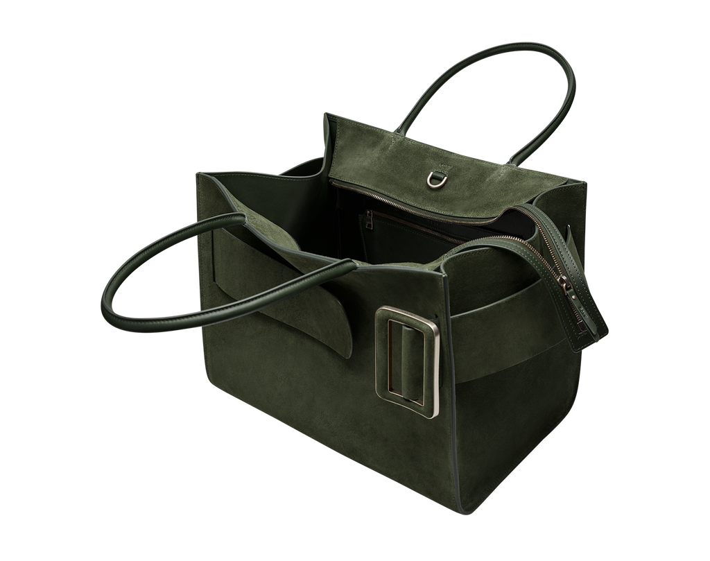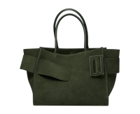 Calfskin suede leather handbag. Calfskin lining. Tone on tone edge paint. Oversized metal and leather buckle and leather belt with twin carry handles. Open top with zip closure. Inside zipper pocket and pouch.