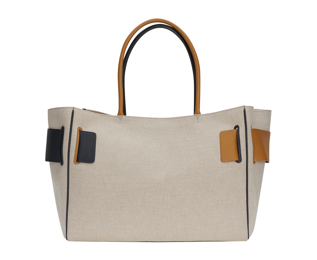 Canvas handbag with canvas lining. Leather edge piping with metal hook fastener. Interior leather pocket. Oversized leather buckle and leather belt with twin carry handles.