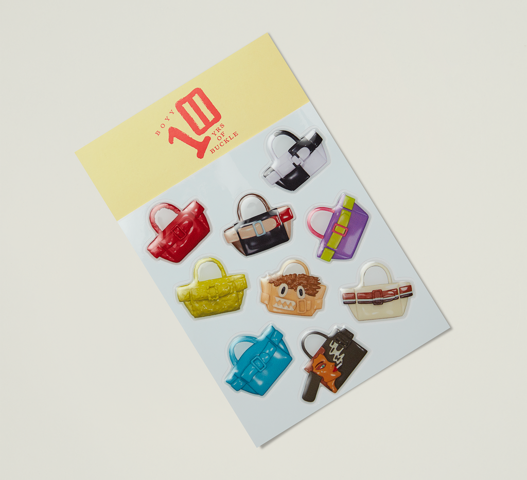 Puffy Sticker set featuring the 10th anniversary Bobby Bag collection. Designed exclusively for the 10 Years of Buckle Exhibition.