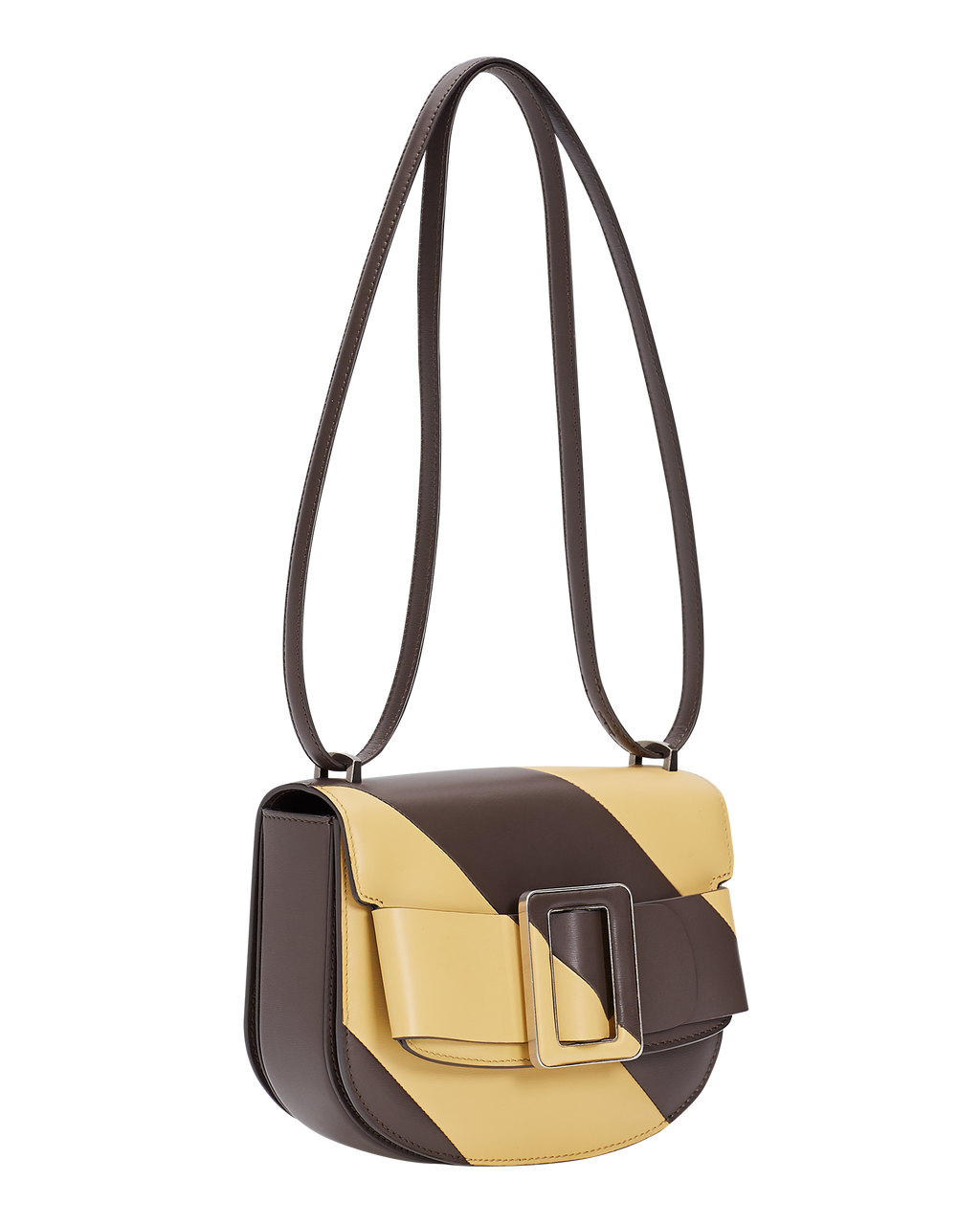 Falcon polenta brown yellow BOYY SADDLE bag made of palmellato calfskin leather, with a structured saddle-shaped silhouette, flap closure, adjustable shoulder-to-crossbody strap, and signature oversized buckle 3/4
