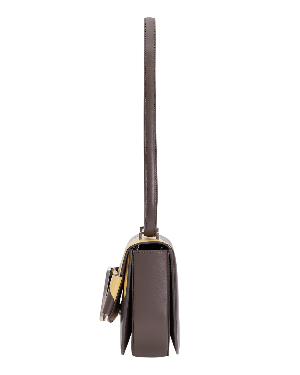 Palmelatto calfskin leather handbag. Lambskin lining in Black color. Tone on tone edge paint. Leather and metal buckle with leather belt. Magnetic closure. Inside card pocket. Adjustable leather shoulder strap.