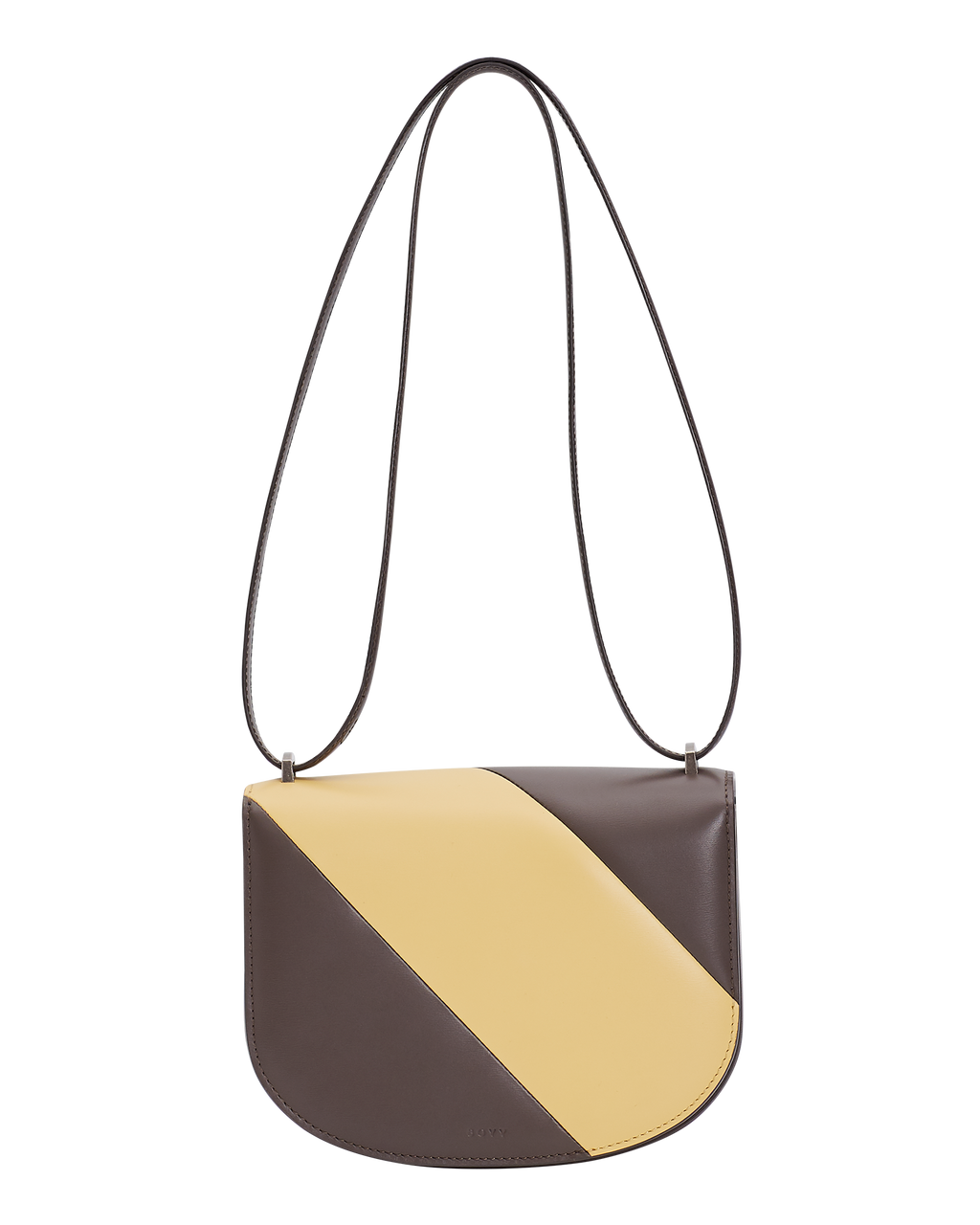 Falcon polenta brown yellow BOYY SADDLE bag made of palmellato calfskin leather, with a structured saddle-shaped silhouette, flap closure, adjustable shoulder-to-crossbody strap, and signature oversized buckle back