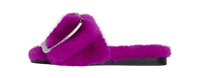 Oversized gold buckle and belt sandal. Minky upper and insole. Leather sole. *Minky is an environmentally conscious fabric, simulating the luxurious look of mink fur through upcycling plastic bottles, offering a truly authentic alternative to real mink.