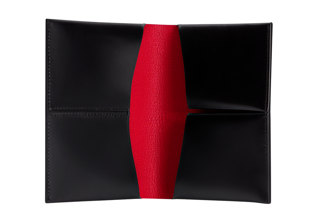 Black box calf leather passport case with lychee red goat skin lining, four internal slots, and a seamless single-piece design. The text “BOYY MILANO BANGKOK” is embossed in gold and silver on the front