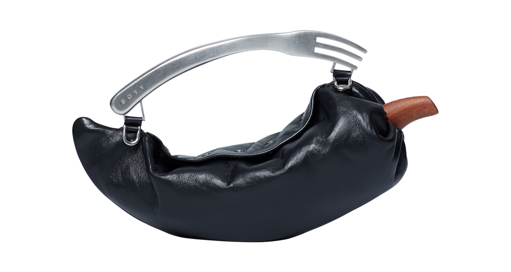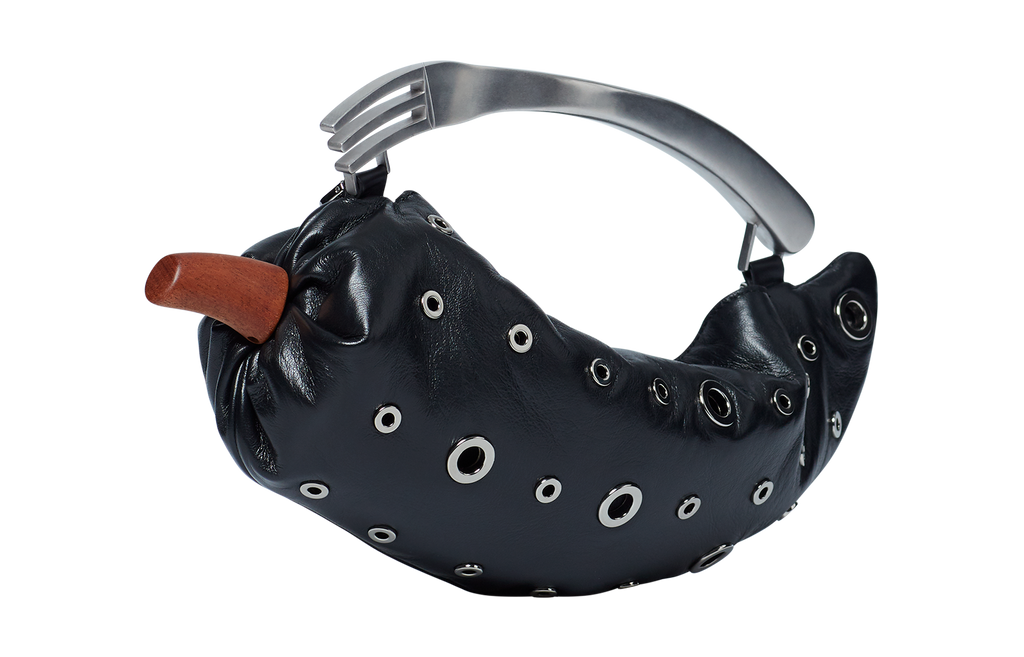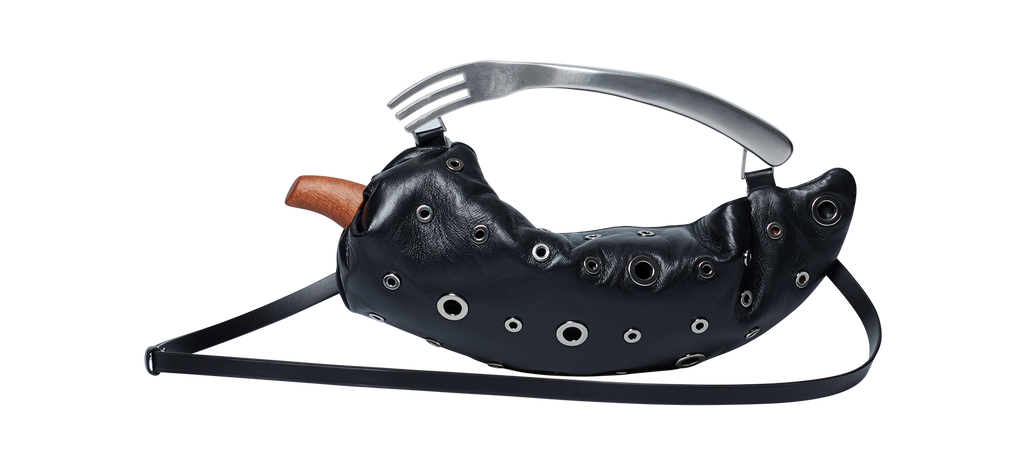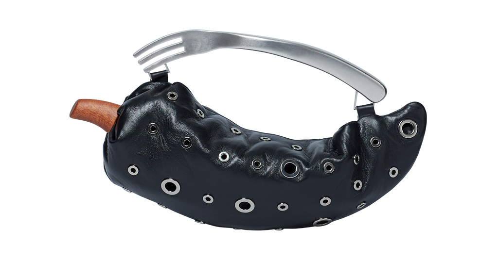 Lambskin bag inspired by a chili pepper with eyelet detailing. Silver fork-shaped handle. Wooden stem detail. Magnetic flap closure. Adjustable and detachable crossbody strap.