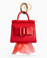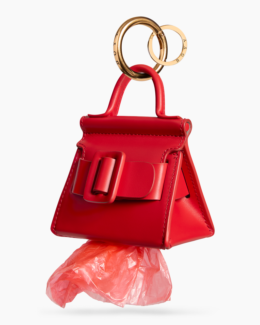 Calfskin BOYY Karl bag charm to hold pet waste bags. This accessory comes with a detachable metal clip, perfect to allow versatile styling and use, allowing you to clip onto leashes or bags.