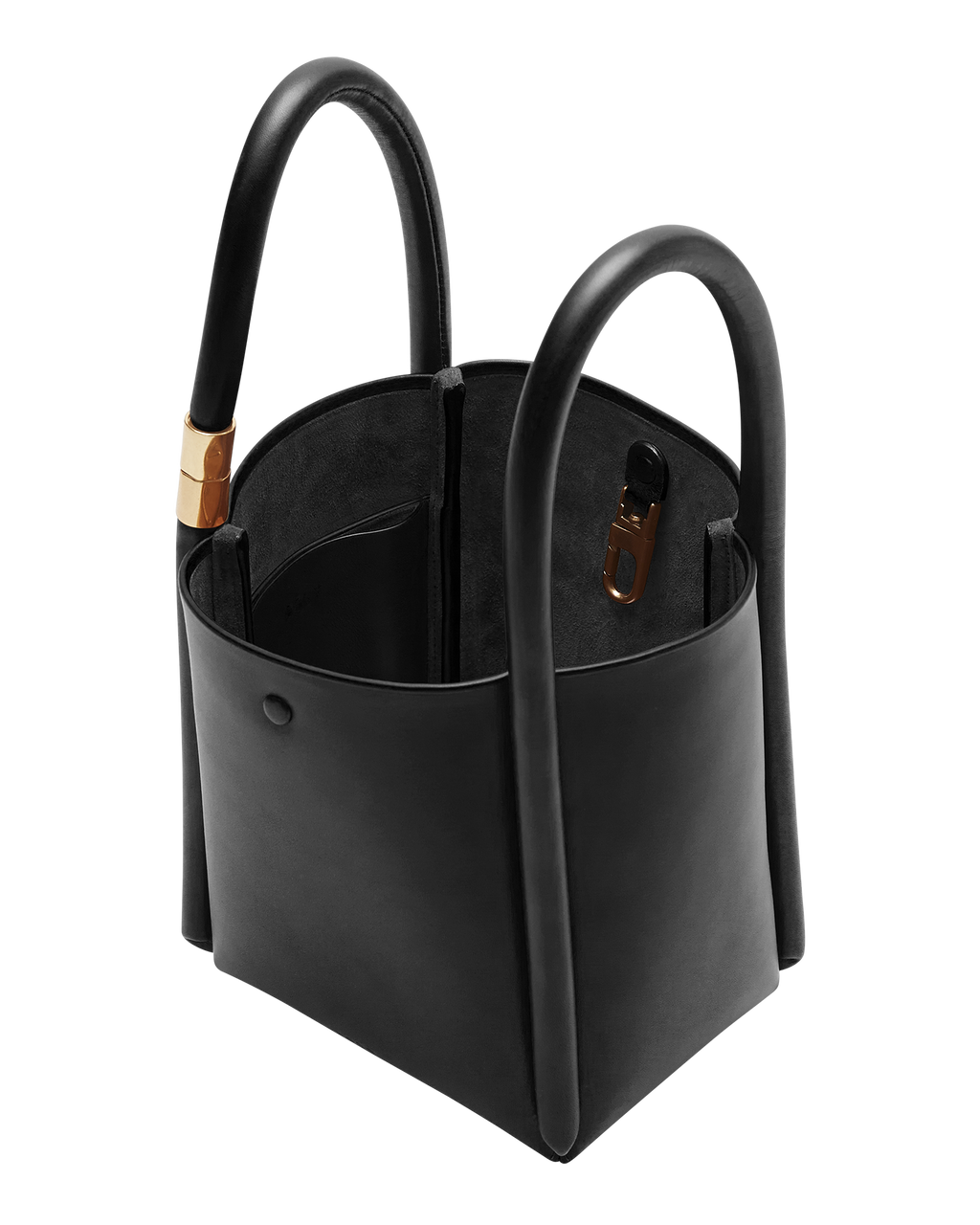 Petite calfskin leather handbag. Calfskin suede lining in Black color. Black edge paint. Oversized edge piping with metal twist fastener. Interlinkable twin carry handles. Inside pocket. Adjustable and detachable leather shoulder strap.