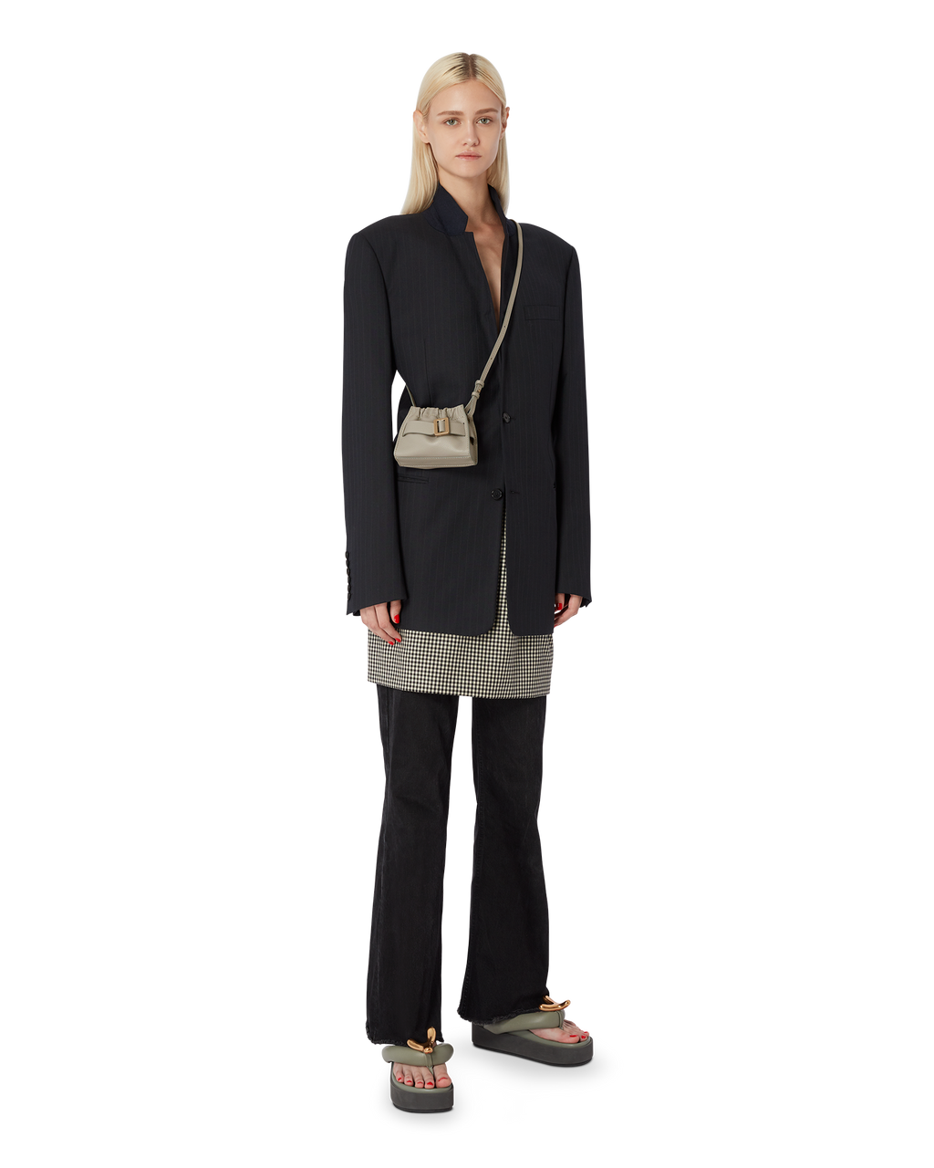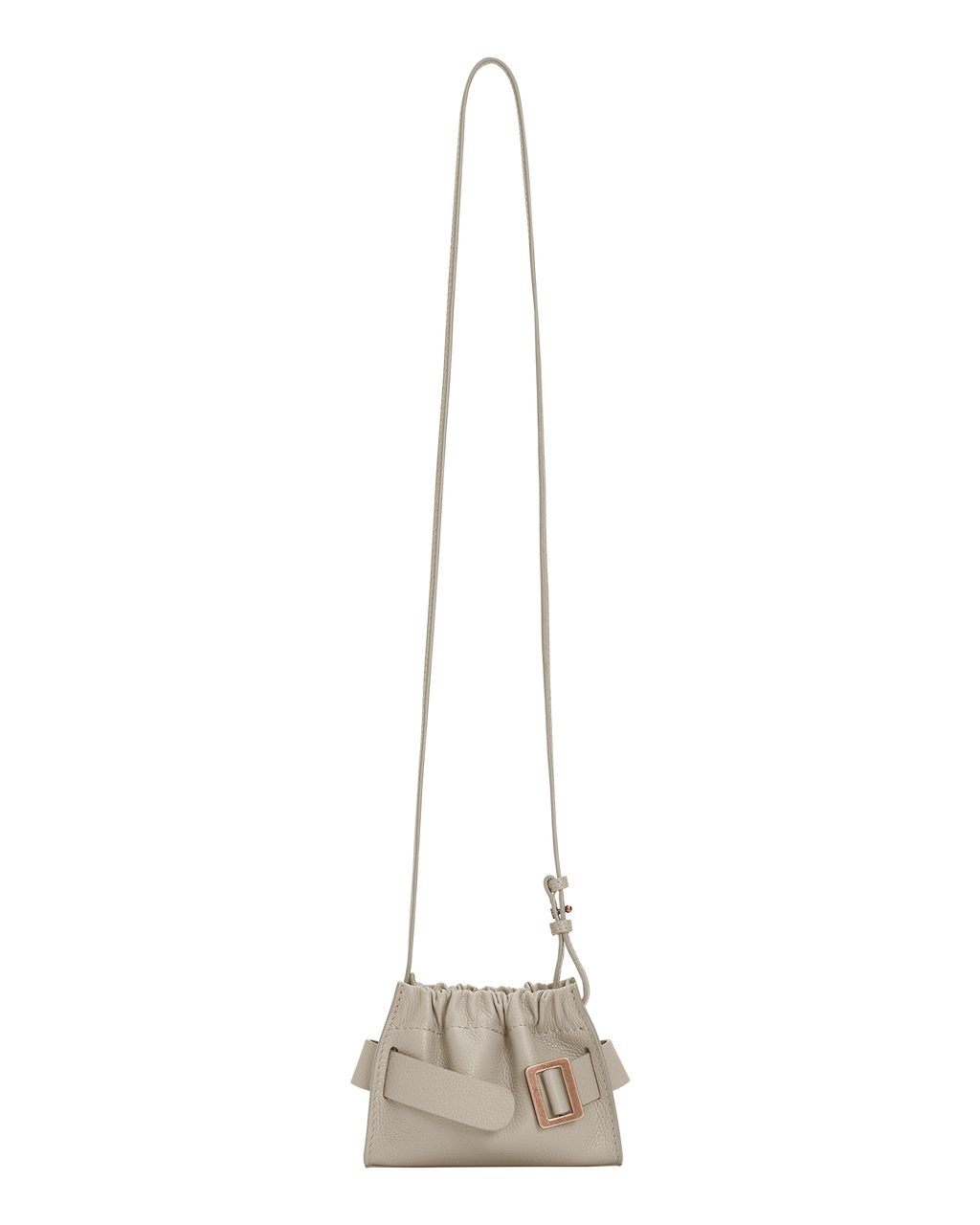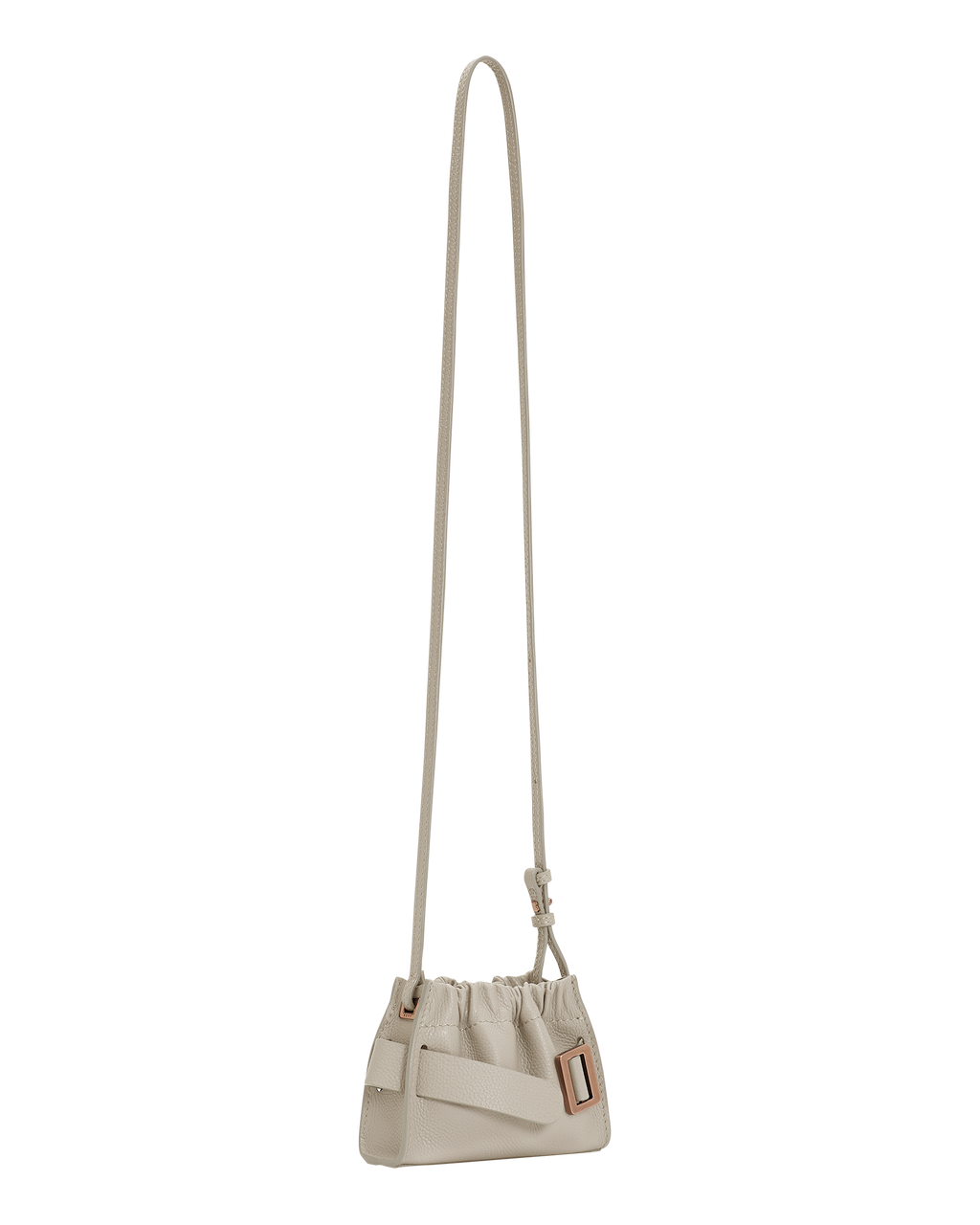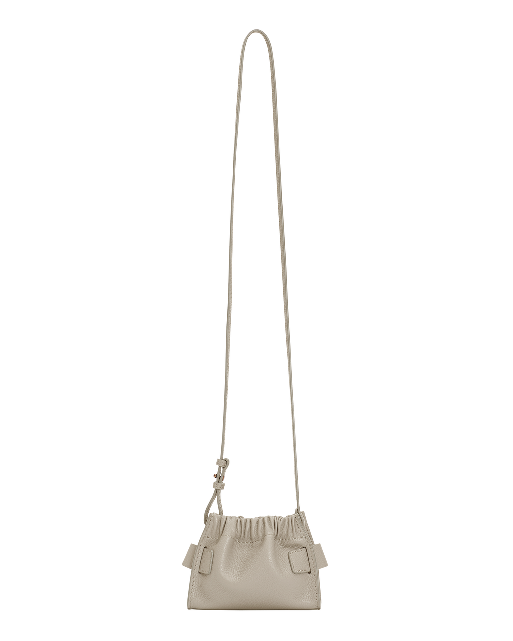 Supple natural grain calfskin leather micro pouch. Calfskin suede lining in Military color. Tone on tone edge paint. Metal bucket and leather belt. Adjustable shoulder strap.