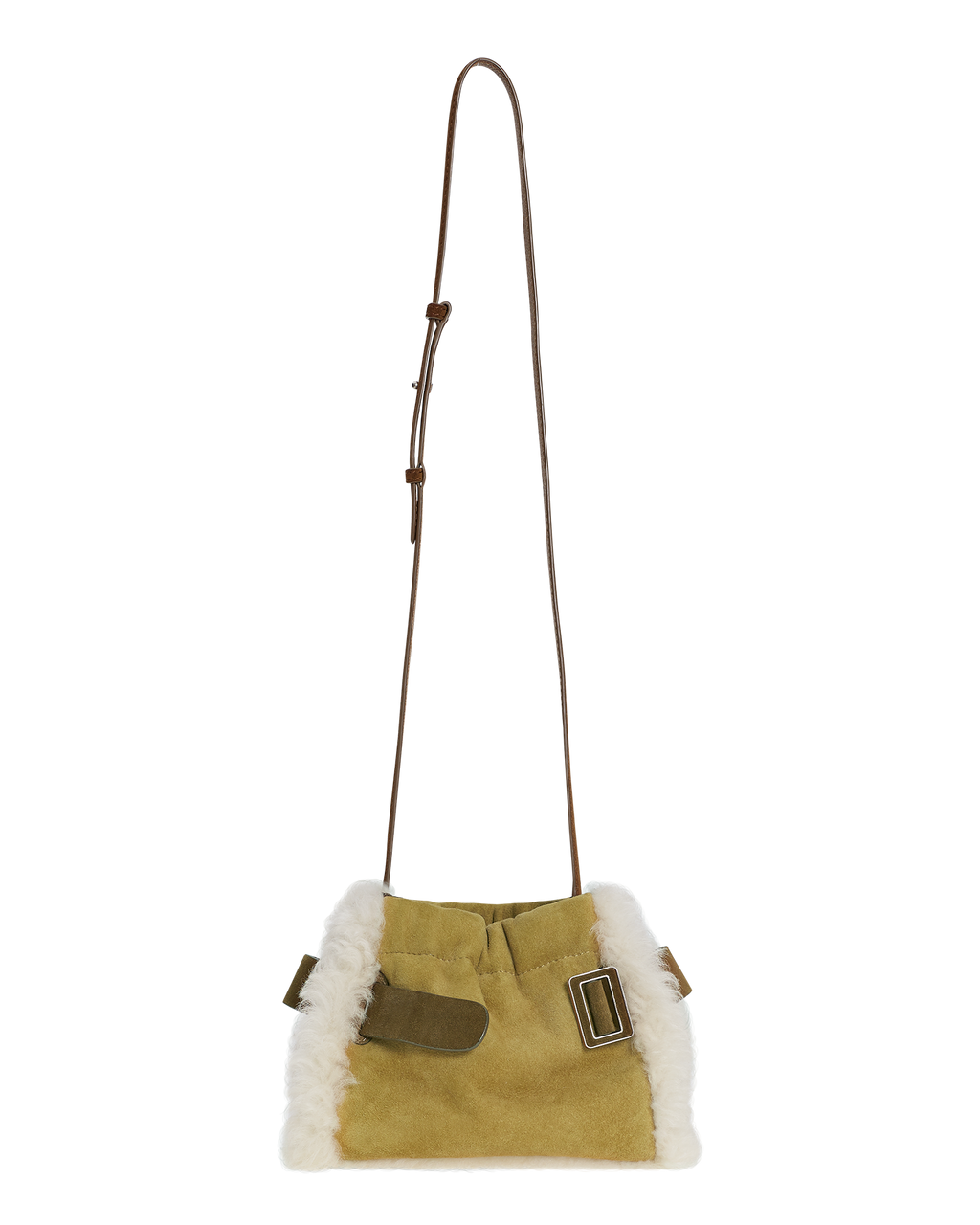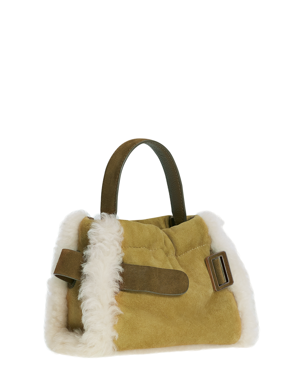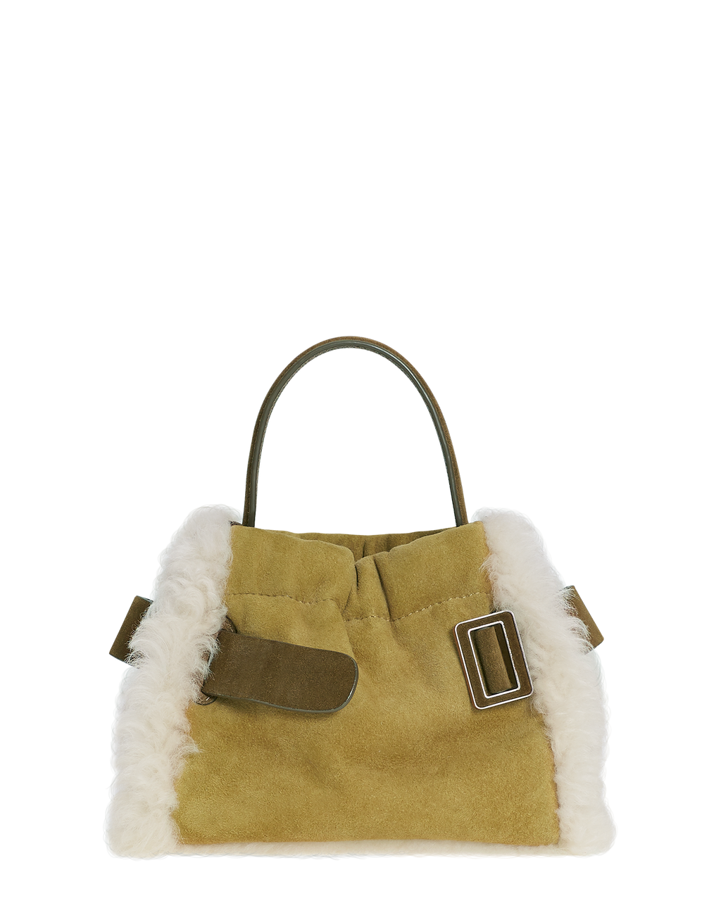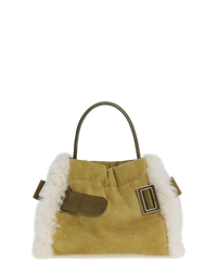 Shearling and calfskin suede mini top handle pouch. Metal and leather buckle and leather belt with single carry handle. Detachable leather strap.