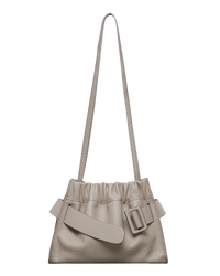 Supple natural grain calfskin mini leather pouch. Calfskin suede lining in Antico color. Darker Tone edge paint. Metal and leather buckle and leather belt. Adjustable two way leather shoulder strap.