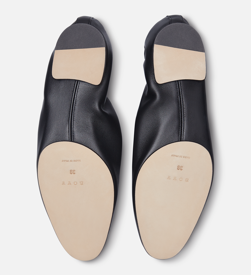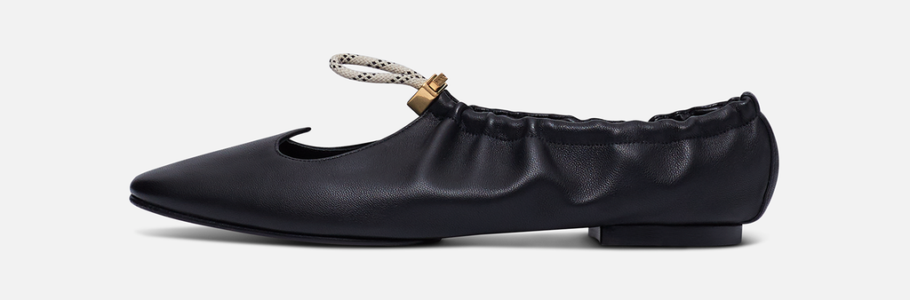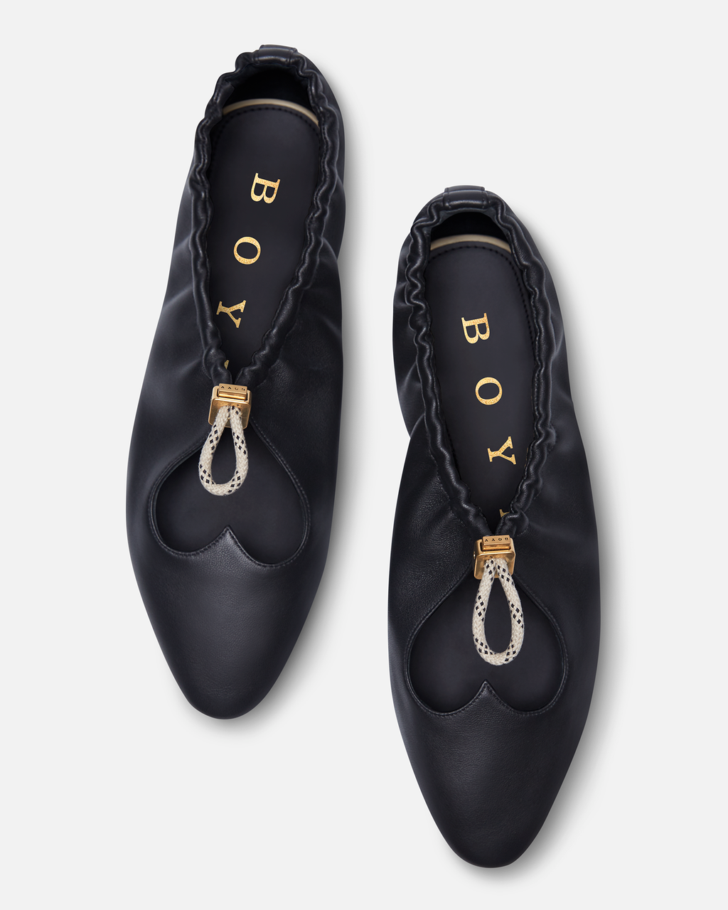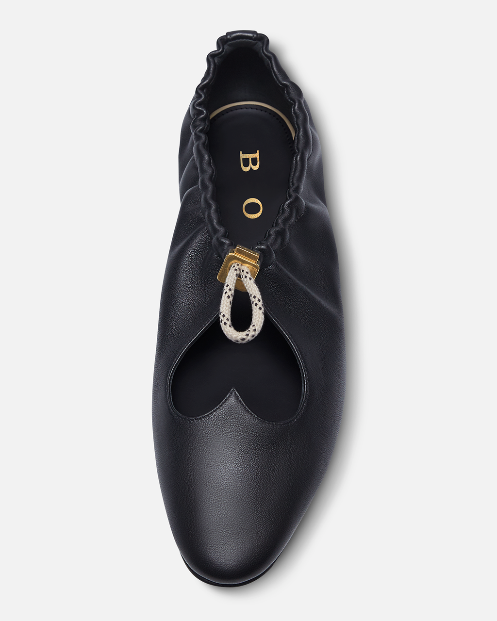 Lambskin ballerina shoe. Lambskin upper and lining. Calfskin insole . Heart-shaped design detail. Silk woven adjustable rope with hardware detail for a customizable fit.