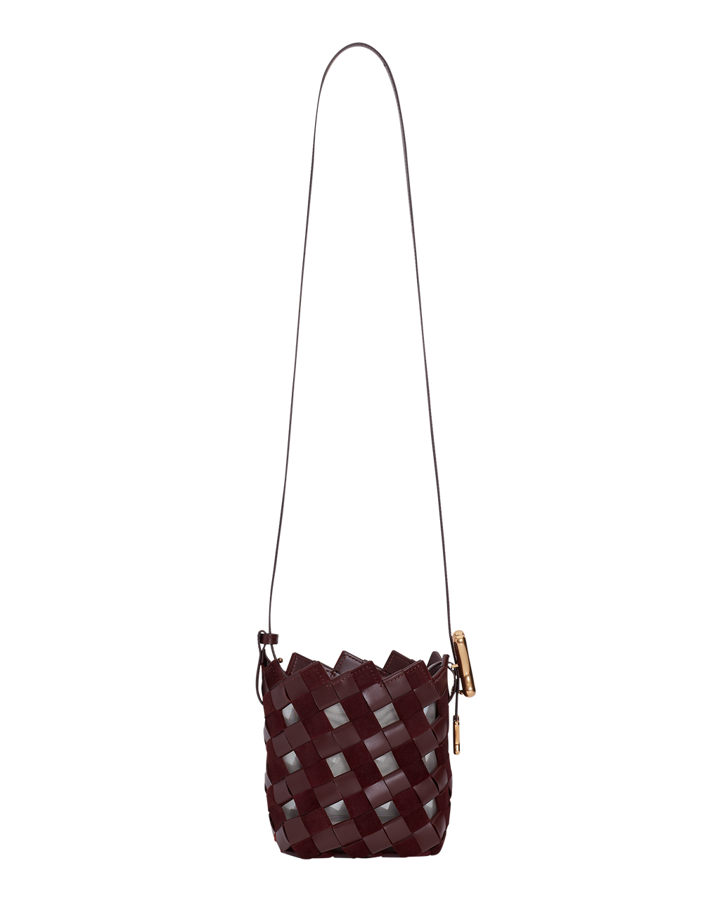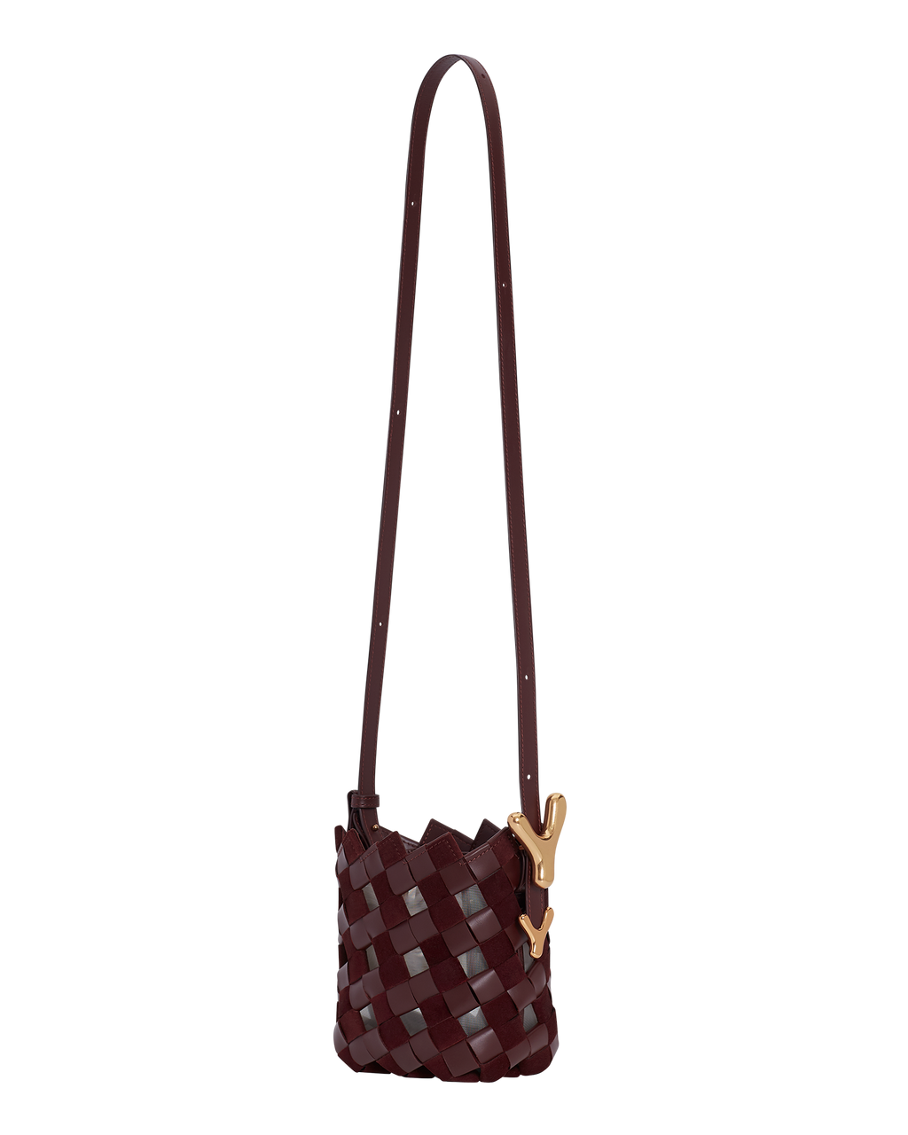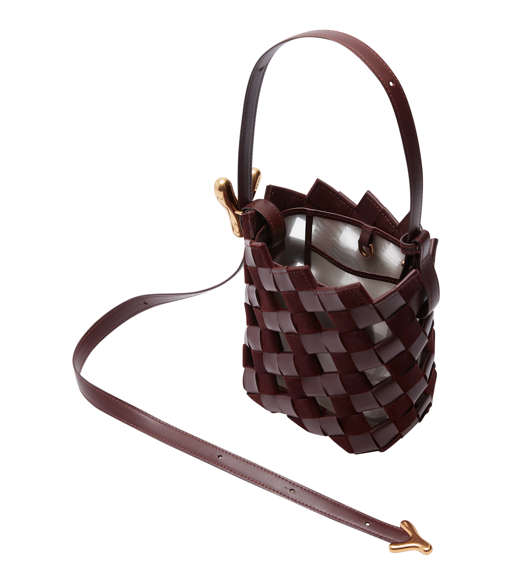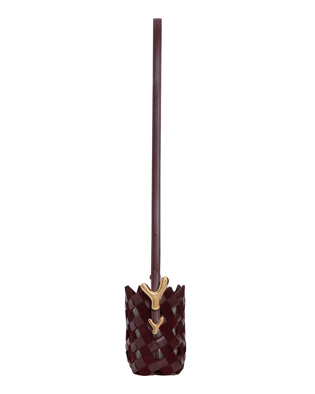 Woven calfskin leather bucket bag. Mesh lining. Open top with gold YY hardware. Inside pocket. Adjustable shoulder strap.