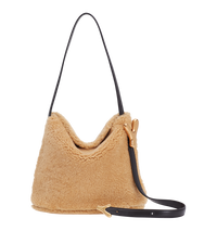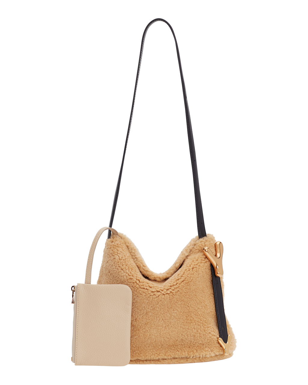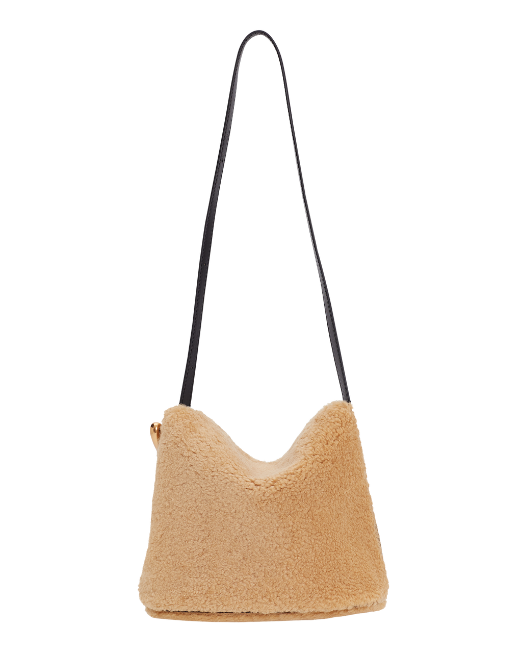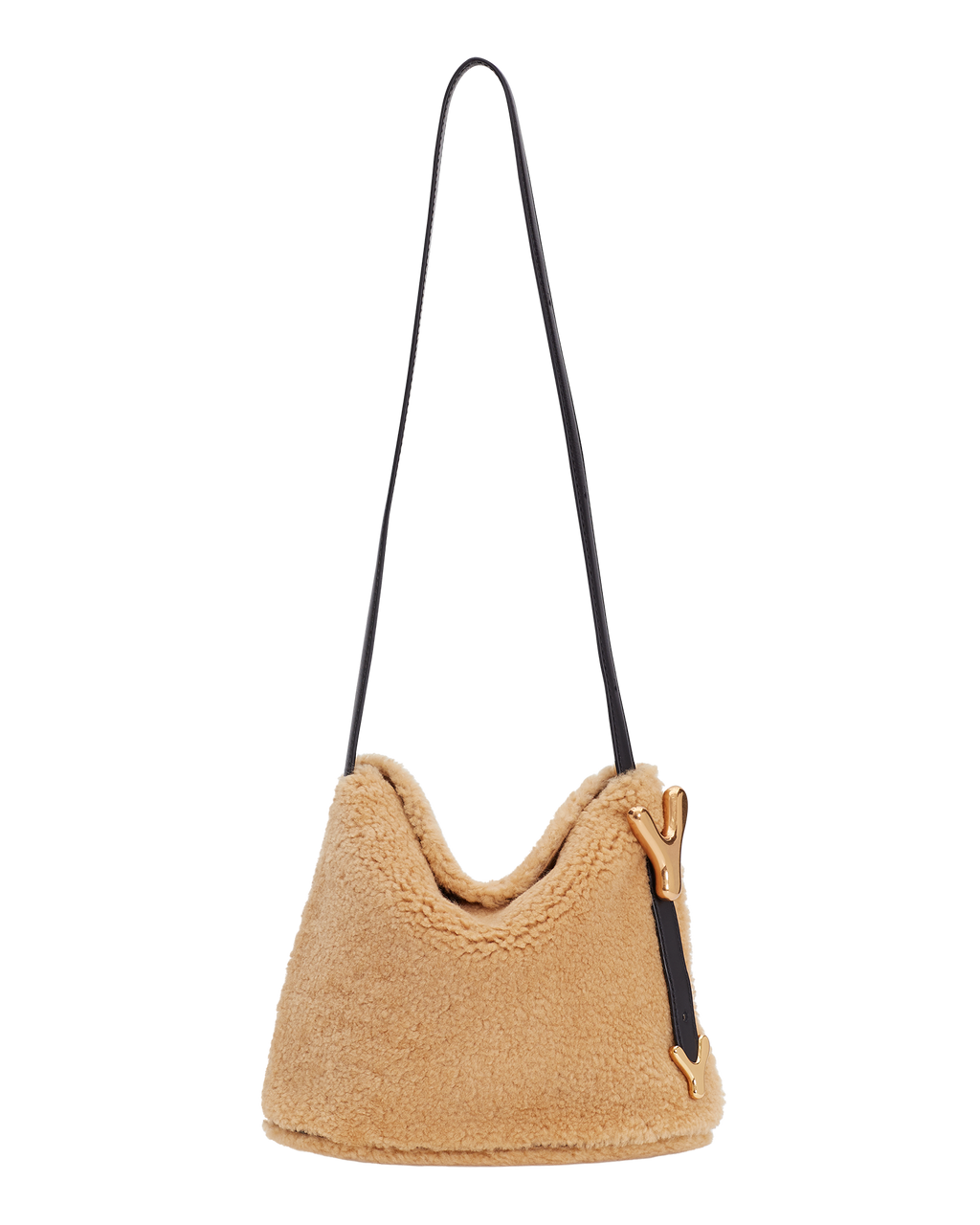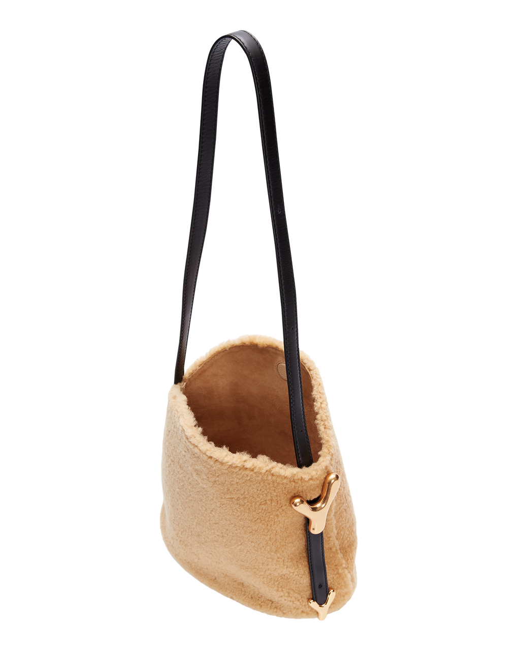 Shearling handbag. Calfskin suede lining. Black edge paint. Inside pouch. Adjustable shoulder strap with antique gold Y hardware.